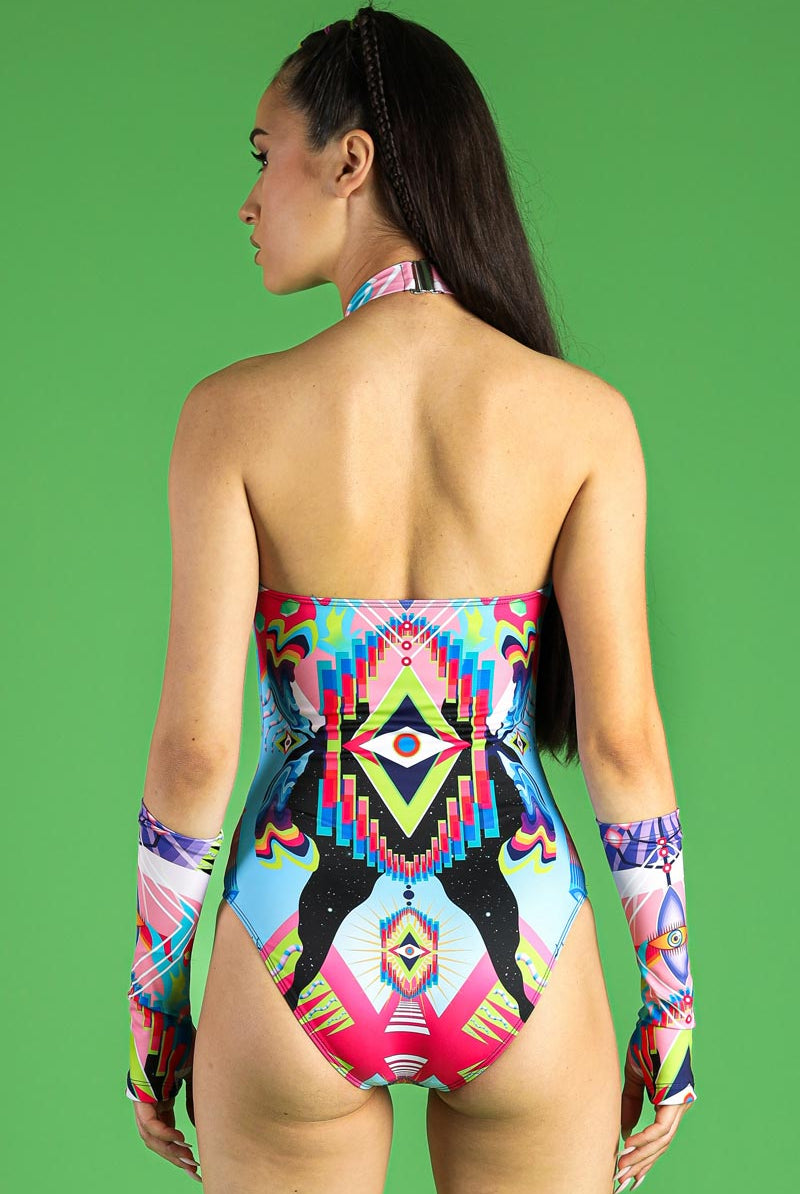 Cut the bullshit and show ‘em who’s the monarch in this regal bodysuit with a broad center cutout in the front. From the halter neckline to the open back - you’re now 100% indecent, and that’s how the rave vibes start floating around you like dark matter. Babe, no one can do it better!