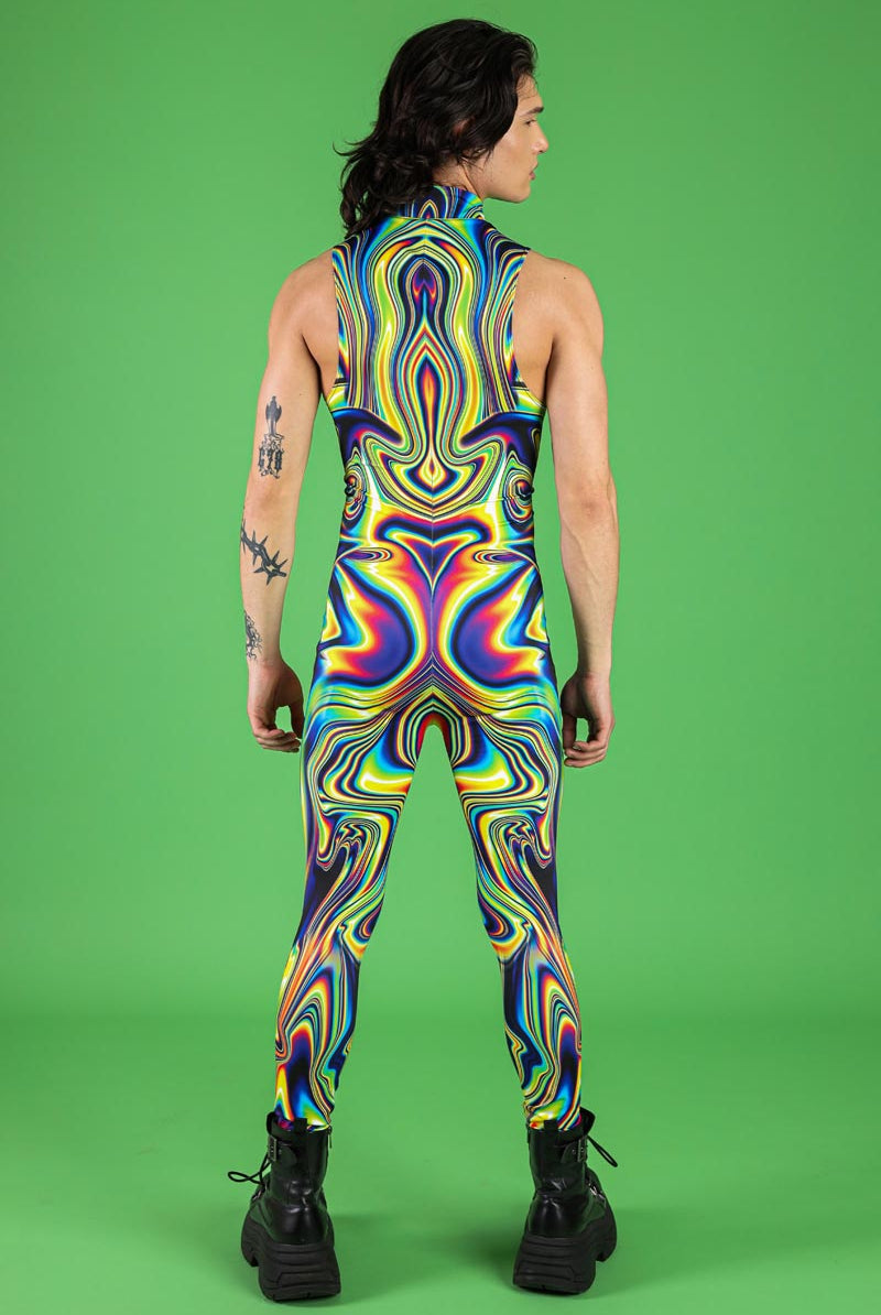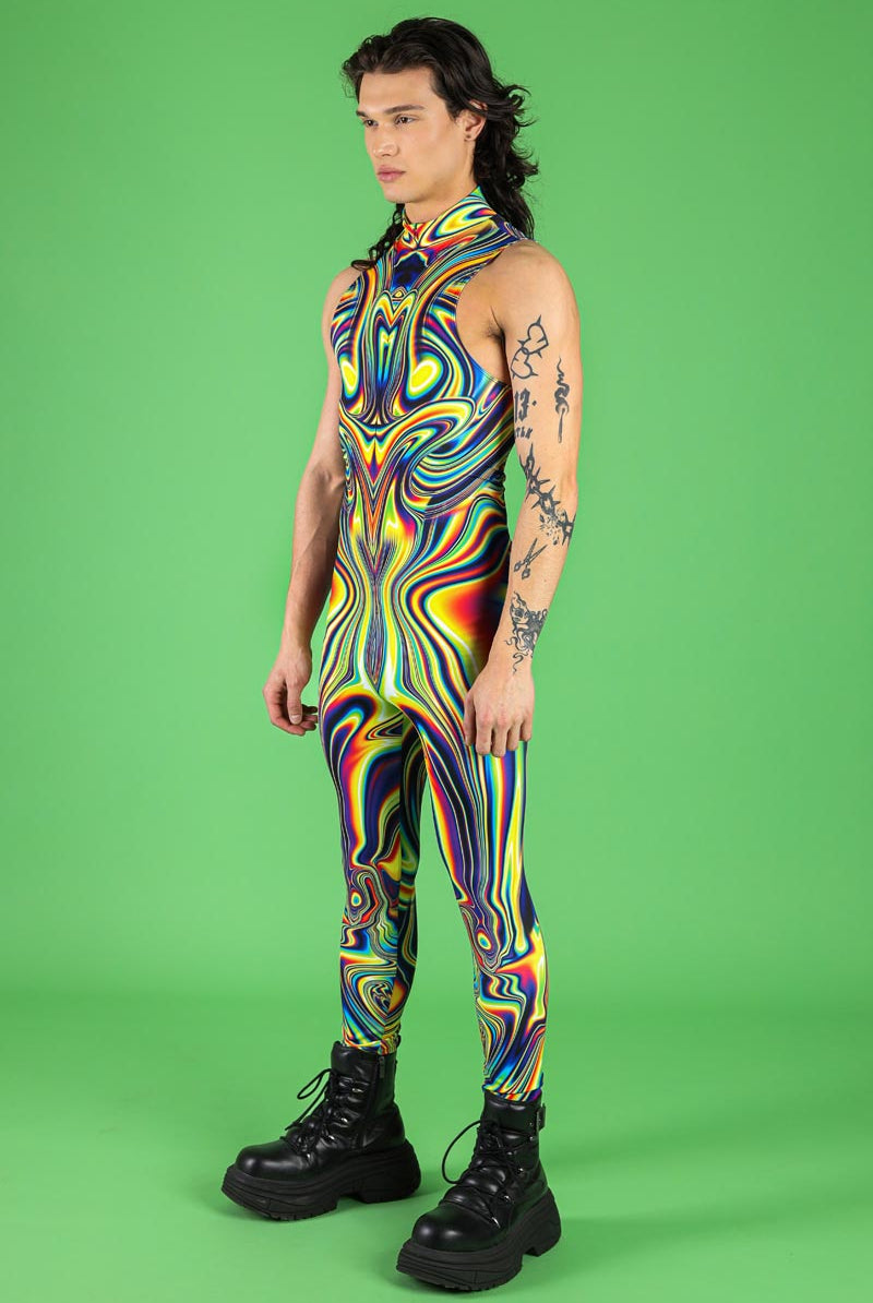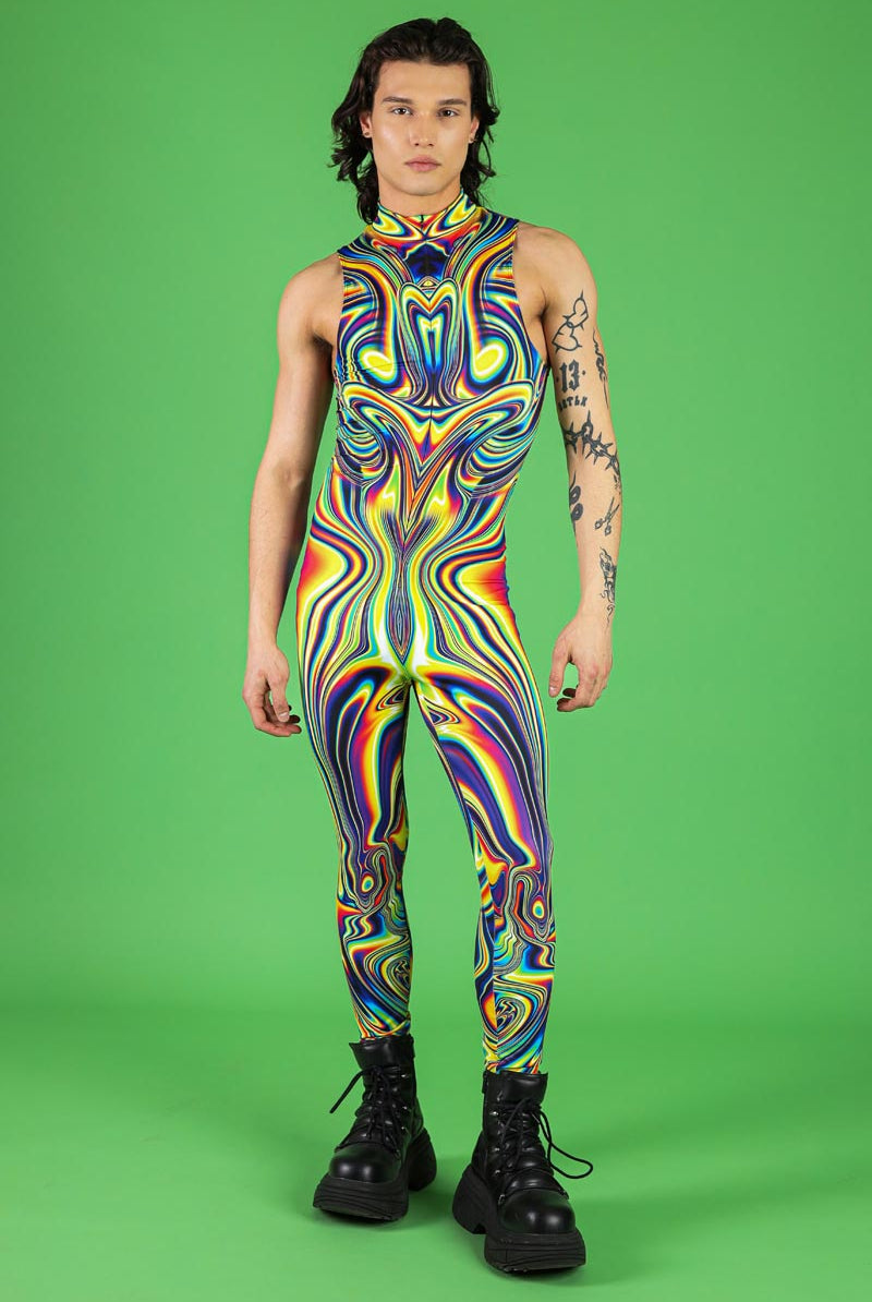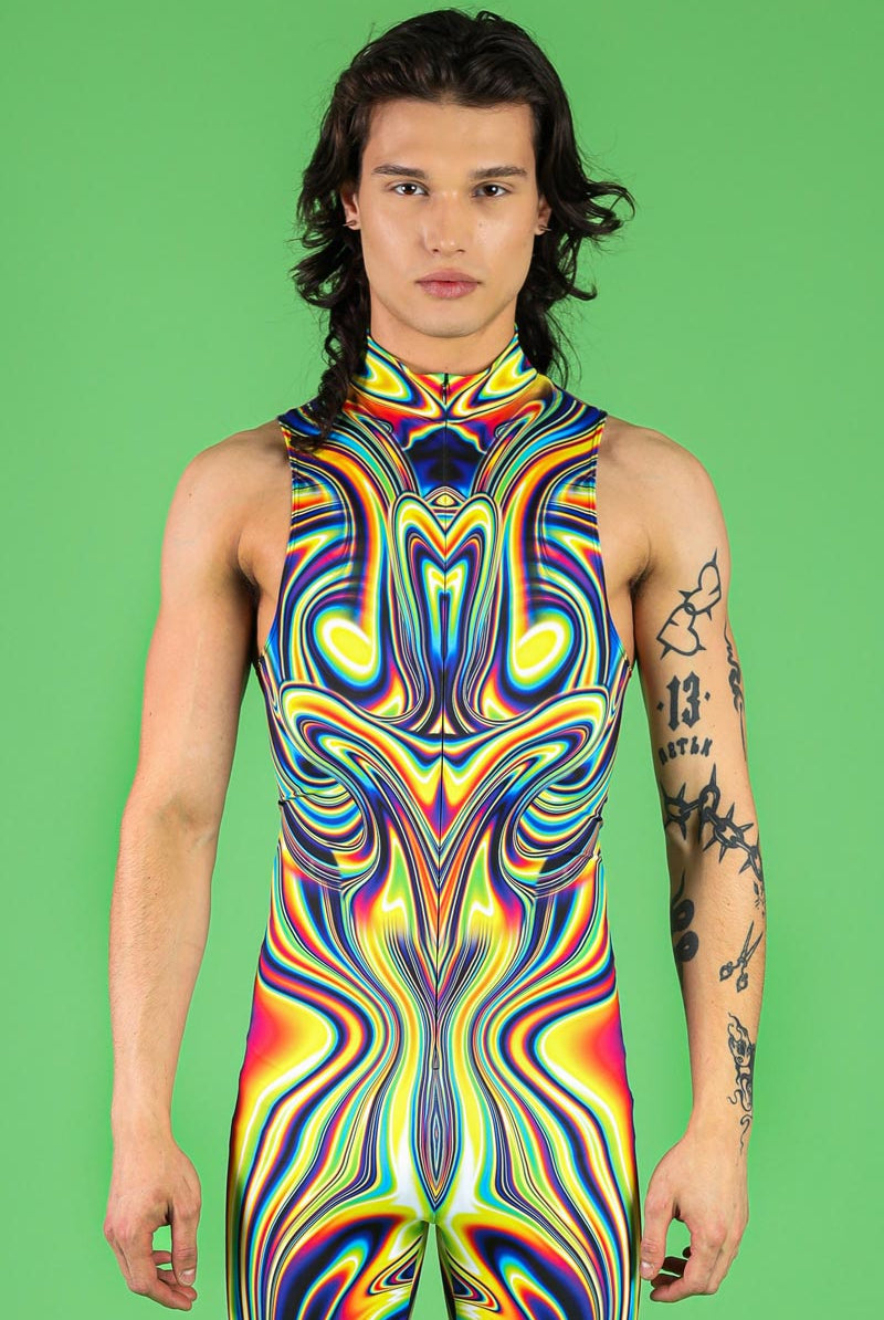 Elevate your festival wardrobe with this eye-catching sleeveless men's costume, perfect for pride events, raves, and other festive gatherings. The bold Acid Flux pattern makes a vibrant statement, ensuring you stand out in any crowd. Featuring a sleek high-neck design, this costume combines style with comfort, hugging your body in all the right places. Its seamless construction allows for effortless movement, making it ideal for dancing and celebrating. This piece is part of our pride collection, designed to celebrate individuality and self-expression.