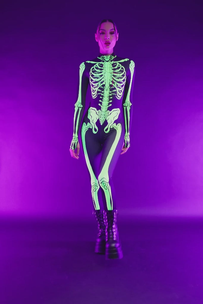 Light up the night with the Acid Skeleton women's costume! This UV-reactive suit glows in bold neon, highlighting its striking skeleton design. The front zipper adds both style and convenience, while the form-fitting fabric hugs your body for a fierce look. Cuz when u step in, the rave is yours. Own the scene with electrifying energy!