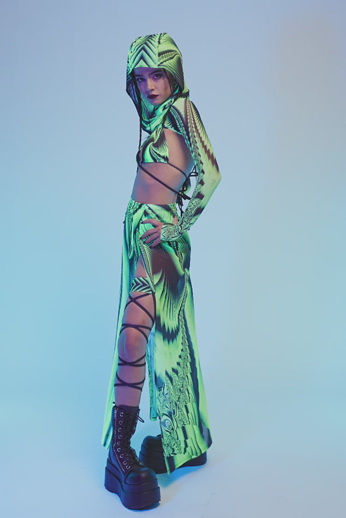 This festival set includes a two piece cut-out top, a maxi skirt with side slits, matching rave leg wraps, and a coordinating rave hood. The layered pieces create a complete, head-to-toe look with strong presence.