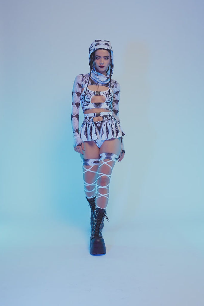 This mini clasp skirt set features a bold two-piece top with buckle details and a bolero overlay for added movement. The sculpted fit defines the waist, while the print keeps it edgy. Finished with adjustable leg wraps and rave hood that frame and elongate.