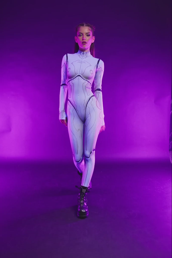Step into the future with the Android Doll women's costume. Featuring a sleek high neckline and front zipper, this UV-reactive bodysuit glows with every move. Designed with a bold, edgy look, it wraps you in a second-skin fit that’s as empowering as it is futuristic. Whether you're a making a cosplay or standing out at any event, this costume ensures all eyes are on u.
