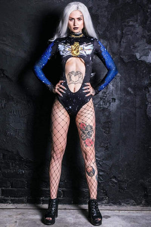 Heaven's hung in black, and it shines through ur open back - in this diabolic angel bodysuit made to rebel and blow. It has wide circular openings on the front and the sides, a sensuous mock neck, and an all-over print of angel wings on a cosmic black setting. Guz ur heart is made of gold, but gold is ever so damn cold.