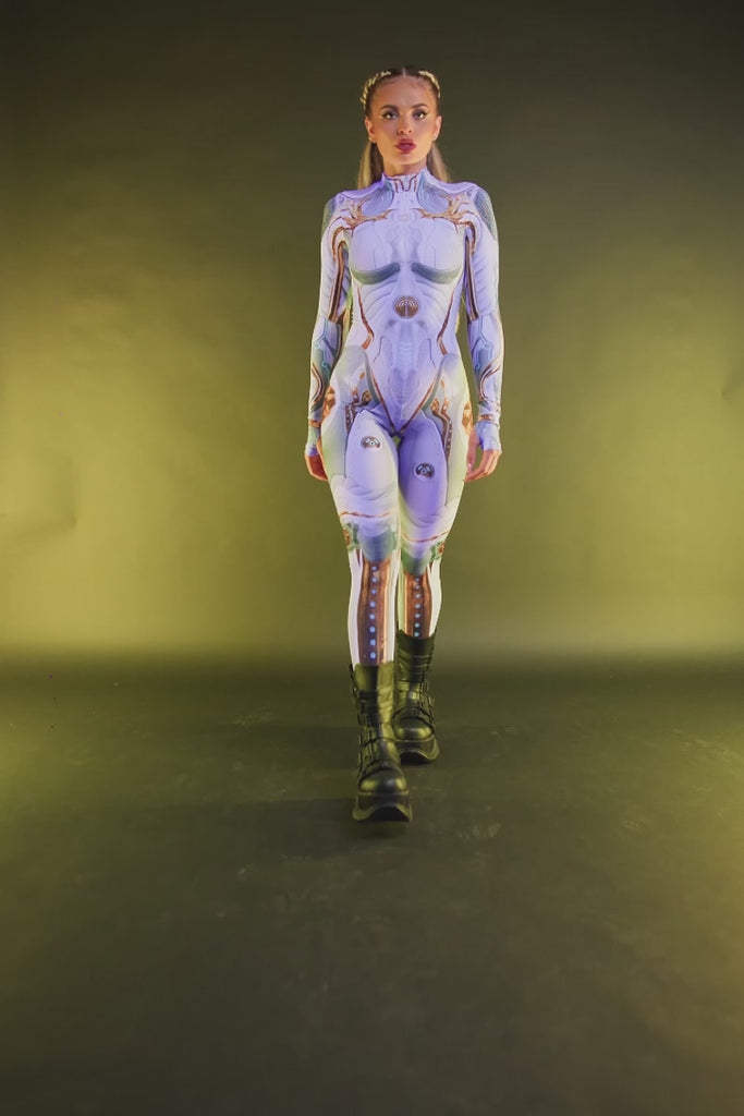 Unleash your inner Arcane Warrior with this UV-reactive costume. Bold, futuristic designs glow under blacklight, commanding attention. Featuring a sleek high neckline and front zipper, it’s perfect for owning any Halloween gathering or festival. Get ready to dominate the crowd with this edgy, statement-making look. Power, style, and confidence—delivered.