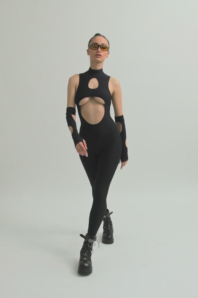 Channel fierce confidence with this sleek black catsuit that features bold cutouts for a daring silhouette. It’s designed to hug your curves in all the right places, with a high neckline that adds an air of sophistication. The cutouts provide a tantalizing peek of skin, while still leaving plenty for the imagination. Perfect for owning the night and leaving a lasting impression.