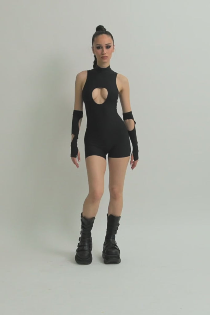 This romper is the ultimate statement piece for those who dare to stand out. The black fabric hugs the body, featuring daring cut-outs that give a glimpse of skin. The high neckline and back zipper ensure a secure fit, while the short cut keeps it playful and flirty—ideal for a night of dancing or any event where you want to leave a lasting impression.