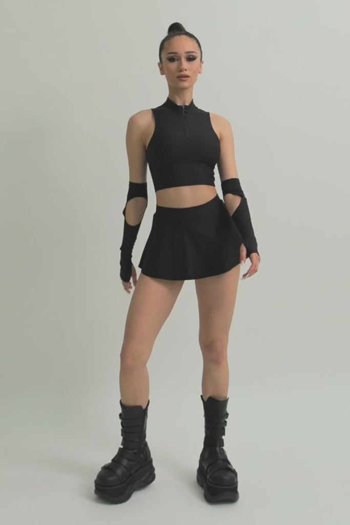 This striking set features a black rave mini skirt designed with a smooth, clean line and a flirtatious flared hem that adds a playful twist to the ensemble. Paired with it is a sleek black half-zip crop top that's all about contemporary charm, with its high neckline and secure front zipper that offers both style and practicality. The top fits snugly, highlighting the body’s natural contours, and the skirt’s flirtatious cut makes it a lively choice for any high-energy event