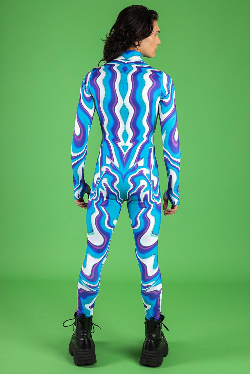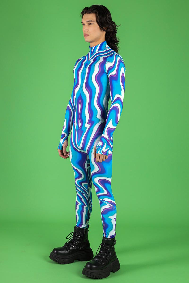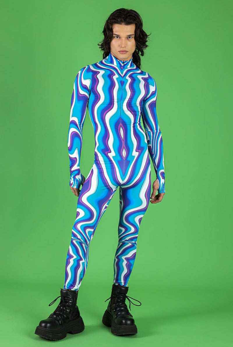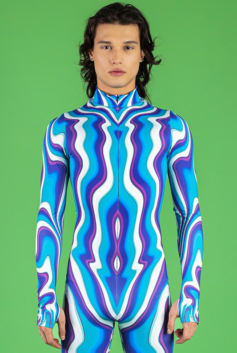 Make a bold statement at your next event with this eye-catching men's costume, perfect for pride celebrations, raves, and other festive occasions. The costume features the Blue Currents pattern, offering a vivid and dynamic look that stands out in any crowd. Designed with a high neckline and long sleeves, this costume ensures both style and comfort. The zip-up front adds convenience and a secure fit, allowing you to move freely while showcasing your vibrant style. Celebrate individuality and pride in this striking piece from our pride collection.