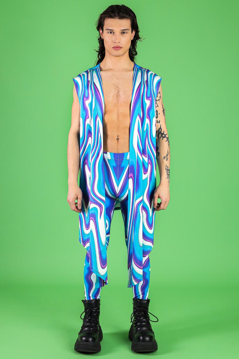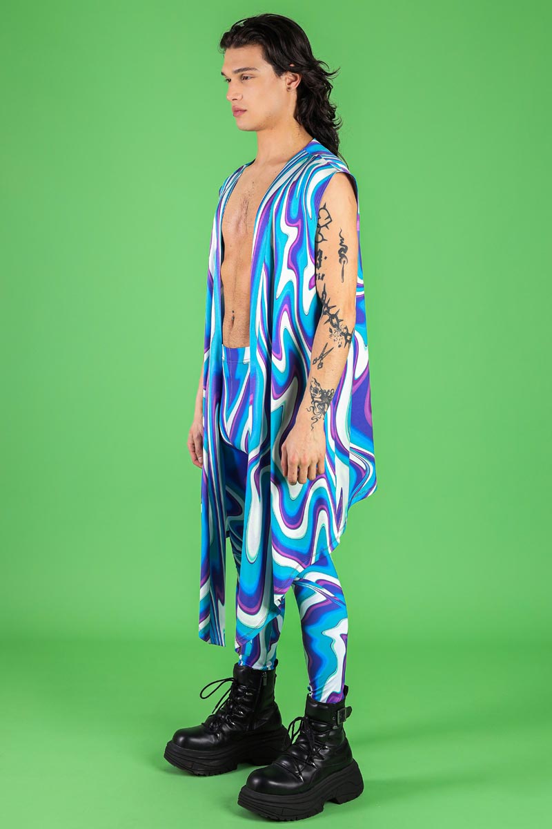 This men's kimono showcases an eye-catching Blue Currents design, perfect for making a bold statement. The open front design allows for easy layering, while the loose, sleeveless cut ensures a relaxed fit. Made from lightweight, breathable fabric, this kimono drapes elegantly over the shoulders and flows down the body, providing both comfort and style. Ideal for pride events, raves, or festivals, this piece adds a touch of flair to any outfit, making you stand out in the crowd.