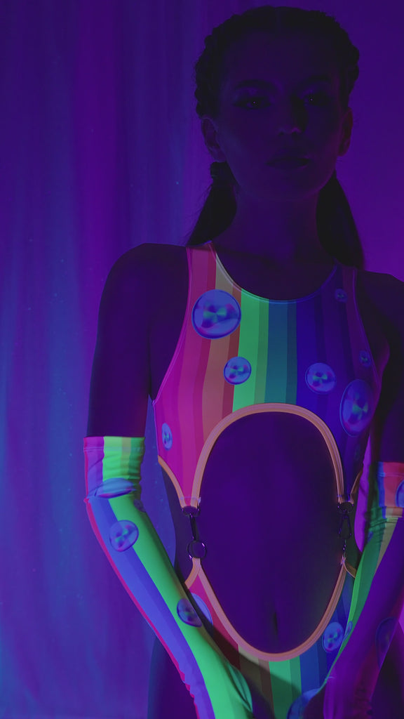 Step into the moment with this pastel rainbow two-piece cut out bodysuit, featuring a massive front cut-out, chunky gold rings, and ultra-high leg lines. It’s soft, stretchy, and made to move with you—so you can serve fearless festival wear with zero limits. Total rave clothing slay.