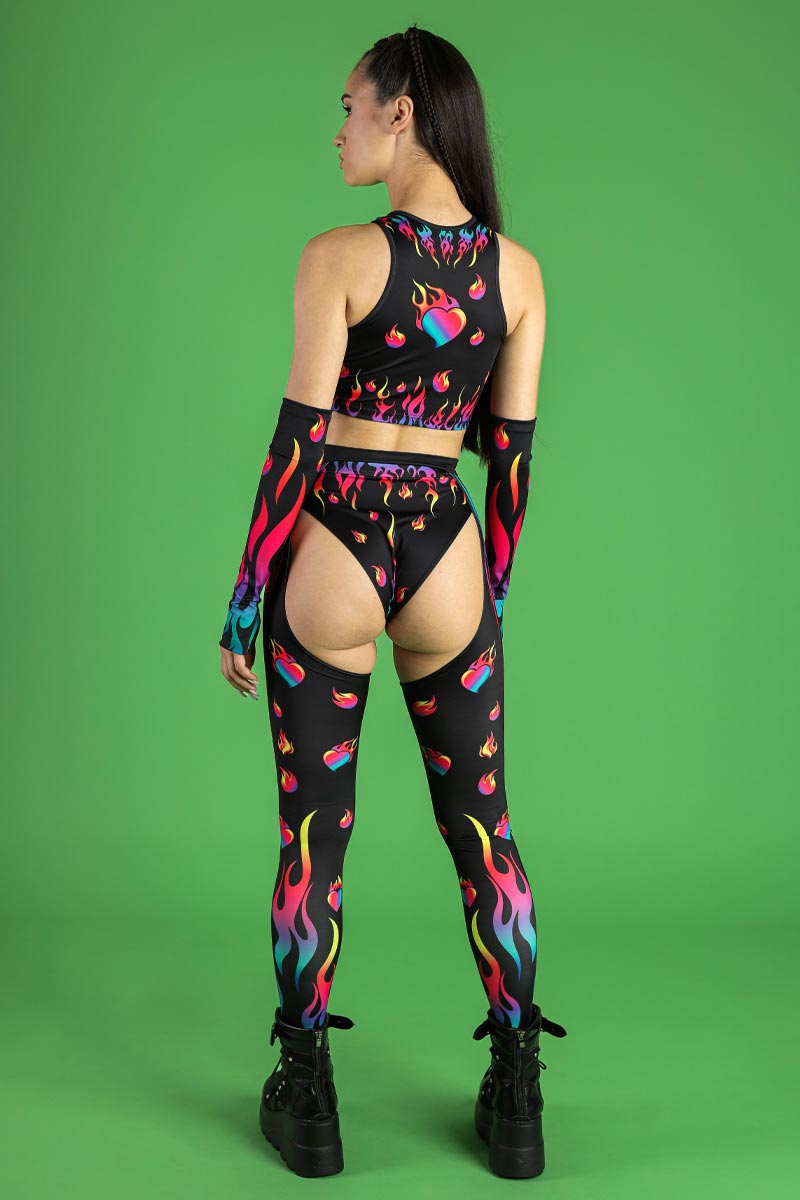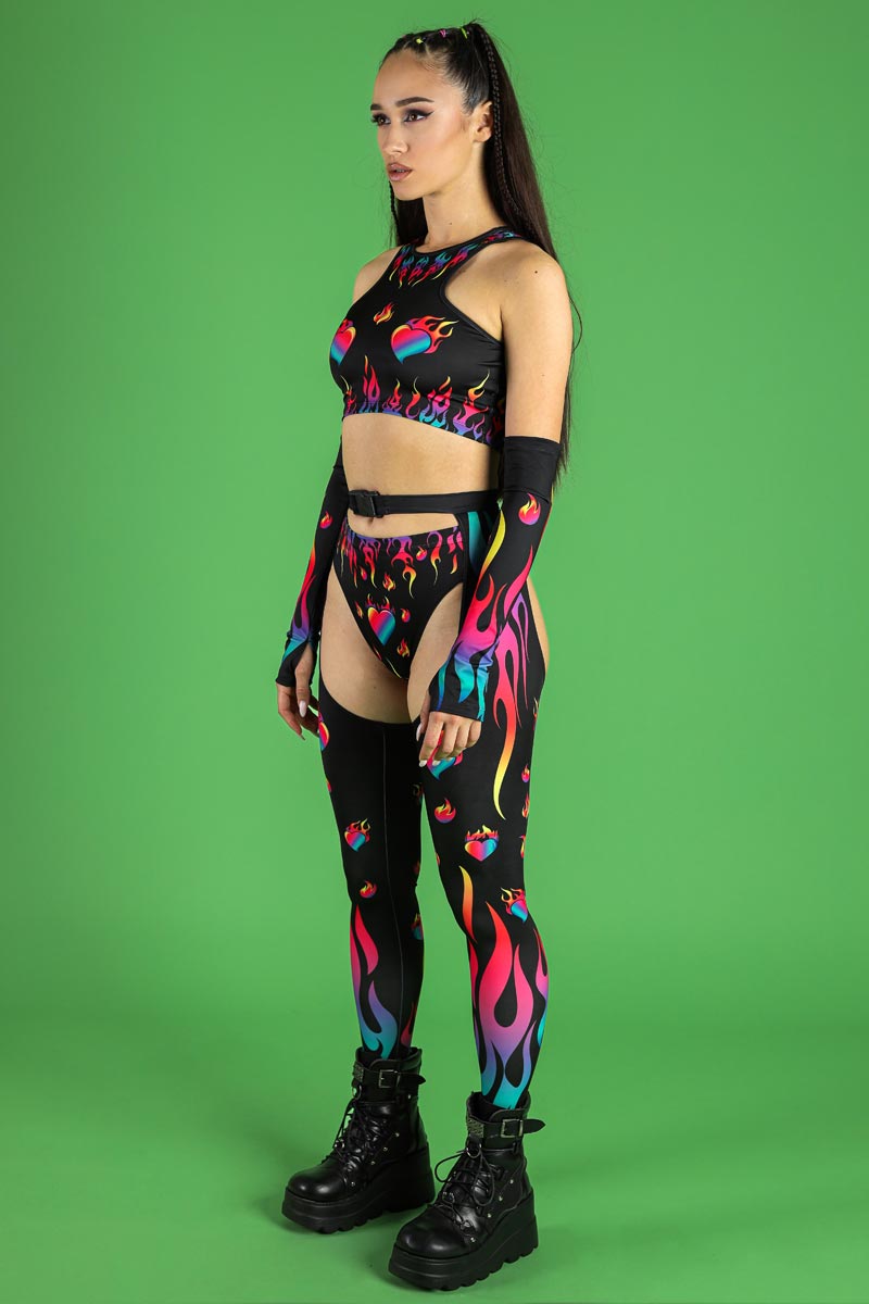 This ensemble includes a crop top and matching chaps pants, both adorned with the Burning Desire pattern. The set is designed to make a standout impact at any pride or rave event, with vibrant colors and dynamic styling. Adding sleeves and shorts to the mix enhances the visual appeal, ensuring you look as great as you feel throughout any festival activities. This coordinated set is not only striking but also emphasizes mobility and comfort, making it a perfect choice for high-energy events.
