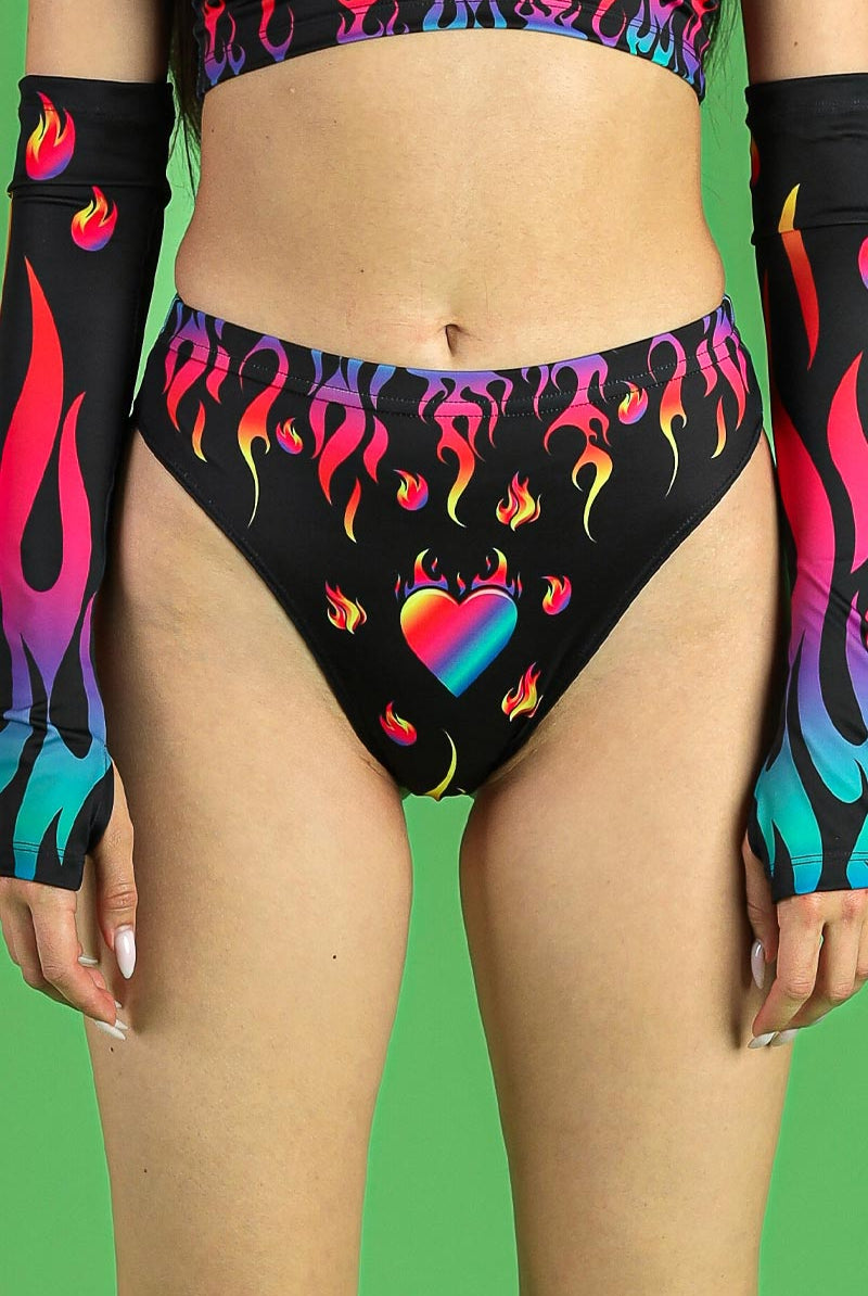 Introducing our high-cut bottoms, adorned with the striking Burning Desire pattern. These bottoms feature a vibrant print of fiery hearts, embodying the spirit of pride and passion. The high-cut design accentuates the legs, making them perfect for festival wear. Part of our pride collection, these pieces are designed for pride events, raves, and festivals, celebrating love and individuality.