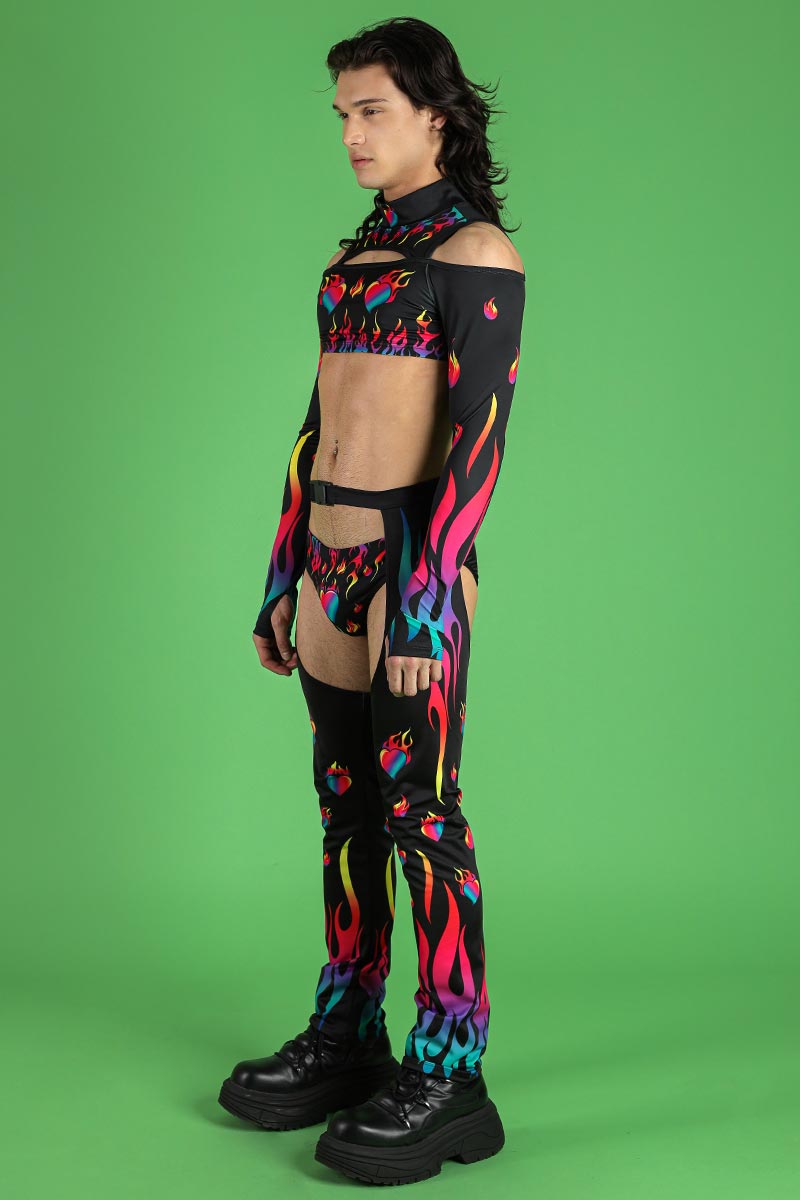 Embrace the full impact of the Burning Desire pattern with this complete set, including the men's cold-shoulder crop top, chaps pants, and low-rise snug briefs. The crop top boasts a high neckline and daring cold-shoulder cutouts, while the chaps pants provide an edgy, layered look over the briefs. Each piece features the vibrant flame and heart motifs of the Burning Desire design, making this set perfect for pride events, raves, and festivals. Stand out in style and make a bold statement with this unique ensemble.