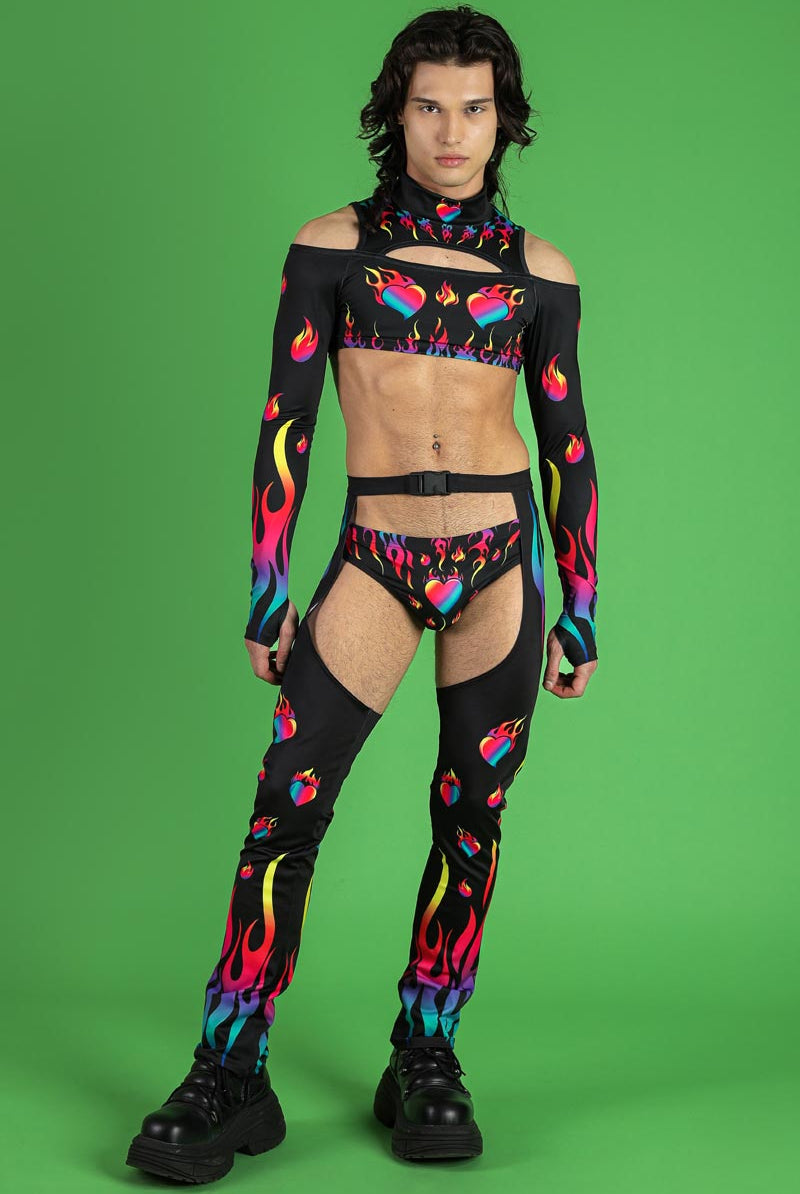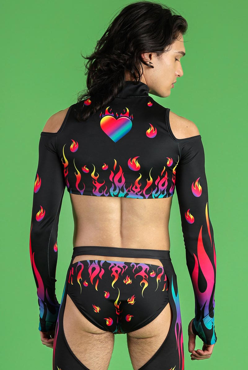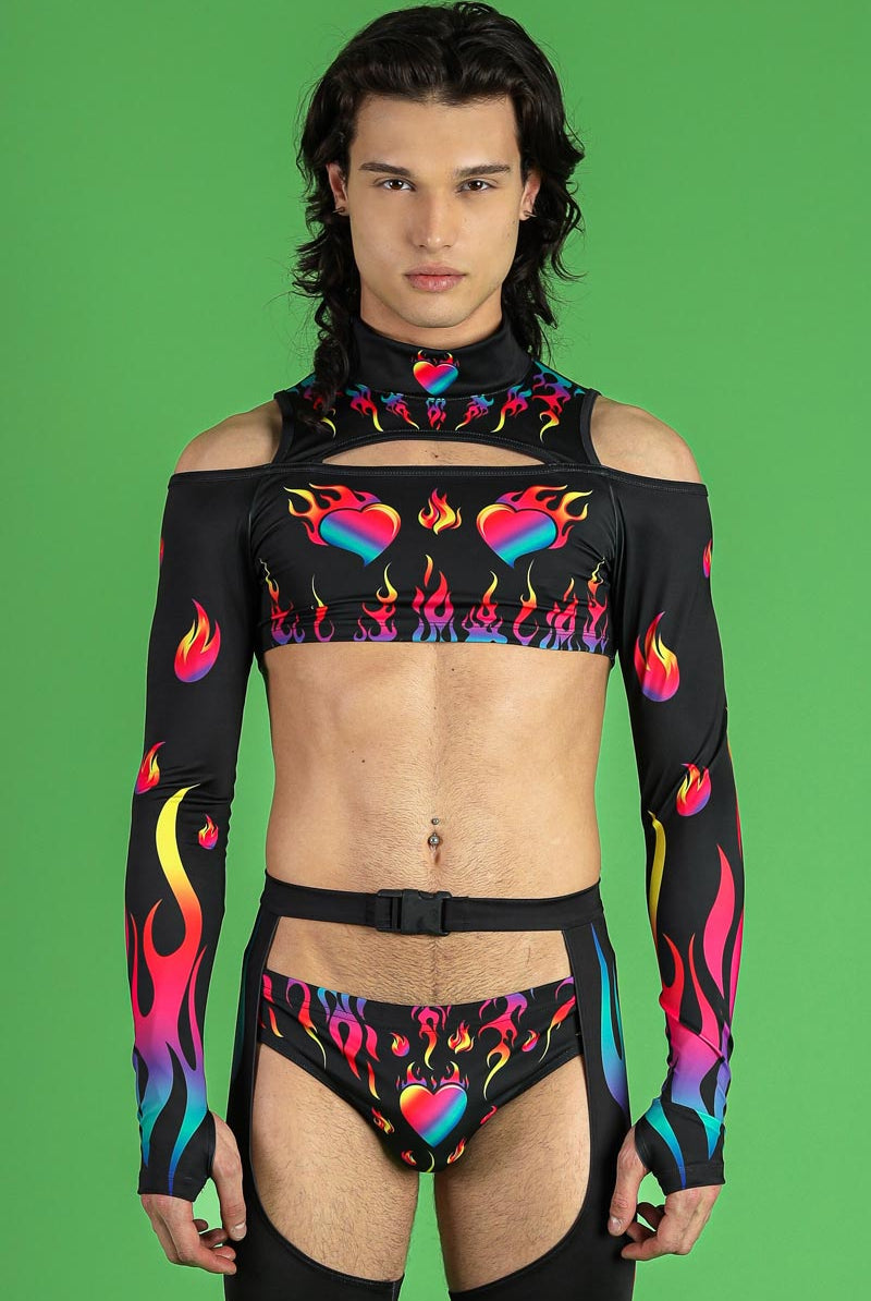 This men's cold-shoulder crop top is a bold statement piece designed for those who love to stand out. Featuring the vibrant Burning Desire pattern, this top showcases a striking print of colorful flames and heart motifs. The high neckline adds a touch of sophistication, while the cold-shoulder cutouts provide a daring twist. This crop top is perfect for pride events, raves, and festivals, making it a versatile addition to your wardrobe.