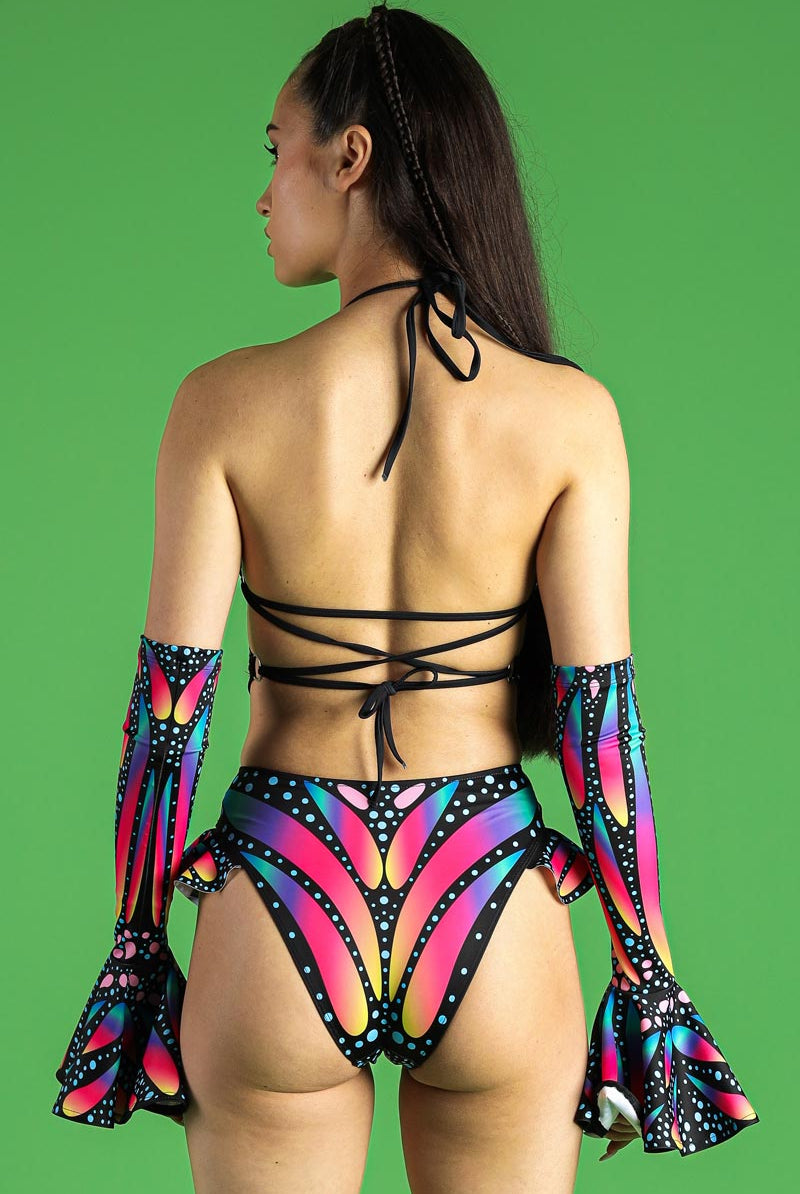 Flaunt a stunning silhouette with the Butterfly Queen top, a vibrant addition to our Pride collection. This butterfly top mesmerizes with its intricate design, highlighted by a strappy back fastening that ensures a perfect fit. Ideal for pride or rave festivals, it pairs beautifully with various styles while offering a striking display of color and flair.