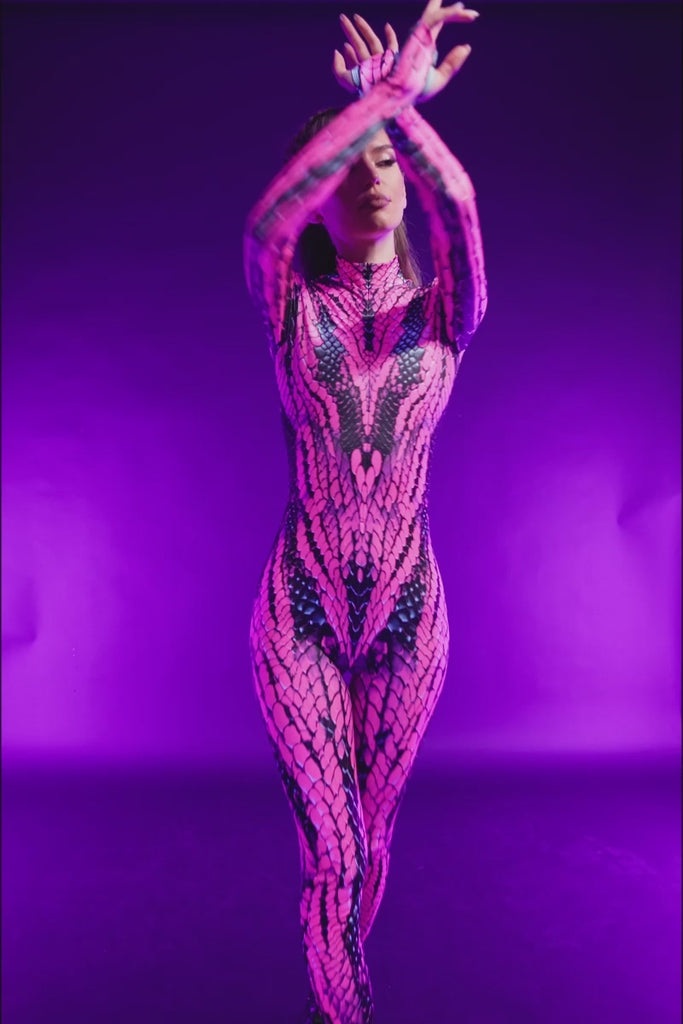 Get ready to strike in the Candy Viper women's costume! This neon pink suit glows under UV light, showing off its bold, scaly pattern. With a front zipper and body-hugging fit, it’s made for those who love to stand out. Cuz when u walk in, all eyes lock on u. Rule the rave with fierce, confident energy!