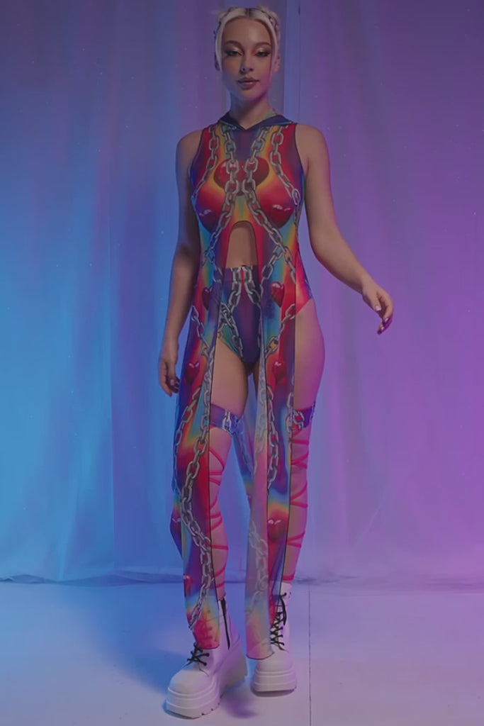 Unleash your inner rave royalty with this hooded tunic dress, dripping in rainbow chains and bold heart prints. Daring cut-outs and sheer fabric keep it breathable, stretchy, and fiercely flattering. Own the dance floor, dominate festival wear, and celebrate self-expression—this is rave clothing, reimagined.