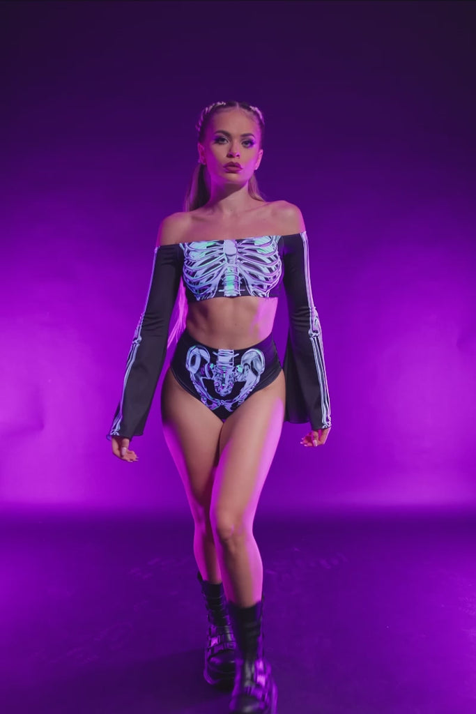 Unleash your rave queen with the Chromatic Skeleton set. This UV-reactive co-ord set glows bright in blacklight, designed to make u pop on the dance floor. The vibrant skeleton print is all about standing out. Get ready to slay the night and own the crowd.