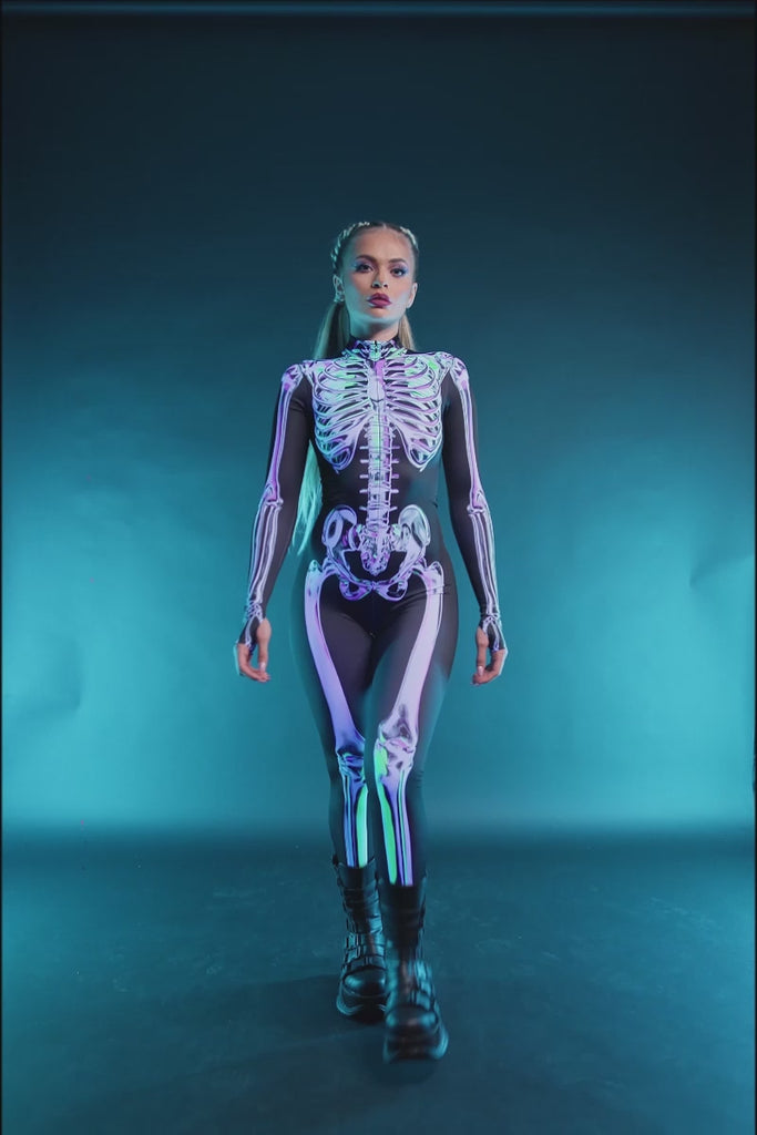 Glow in the dark and steal the spotlight with this Chromatic Skeleton costume. Featuring a high neckline and front zipper, this UV-reactive suit is a bold blend of fierce and fun. Perfect for raves or Halloween parties, this edgy look gives you control over the dance floor. Ready to own it?