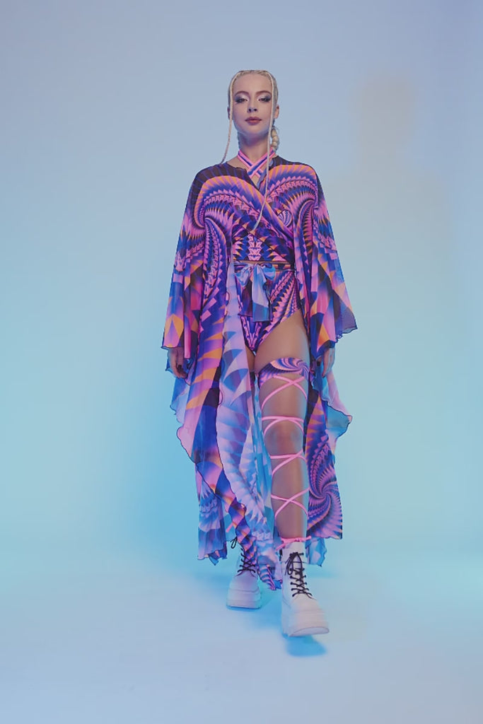This sheer kimono flows in a bold purple print with a dramatic, floor-length silhouette. Lightweight and airy, it moves effortlessly with every step. Designed as a statement, eye-catching rave robe.