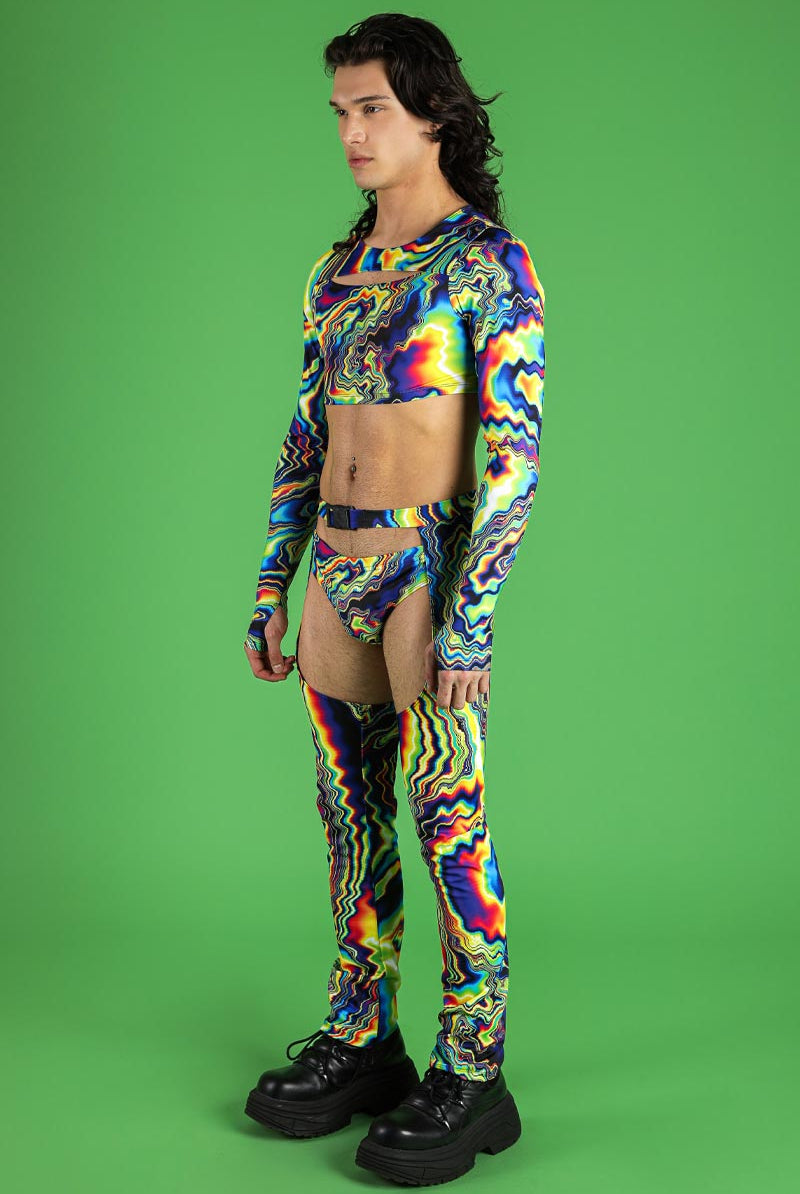 Make a bold entrance with these eye-catching men's chaps pants, designed in the electrifying Color Warp pattern. These pants feature an innovative chaps style, offering a daring and unique look. The snug fit ensures comfort while accentuating your silhouette. Perfect for pride events, raves, or any festival, these pants are a true testament to fearless fashion. Celebrate your style with these standout pants from our pride collection.
