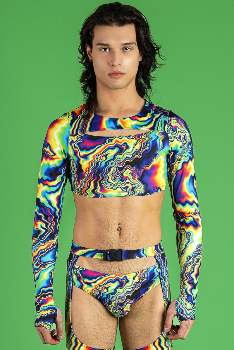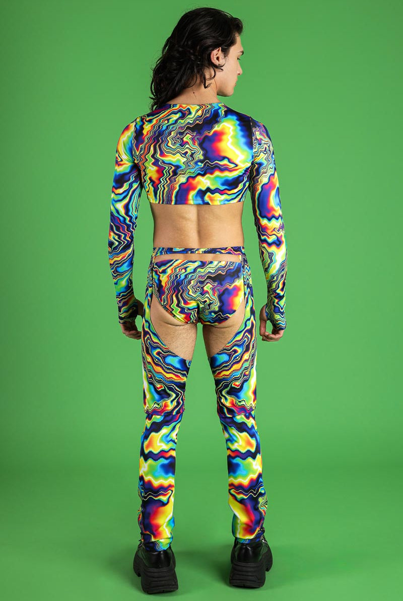 Step into the spotlight with this stunning set, including a men's long-sleeved keyhole crop top and chaps pants, both in the vibrant Color Warp pattern. The crop top features a distinctive keyhole neckline and long sleeves, while the chaps pants offer a bold, unique style. This set also includes men's low-rise snug briefs, providing a complete look that's perfect for any pride event, rave, or festival. The Color Warp print is designed to make you stand out and celebrate your individuality as part of our pride collection. Embrace your boldness and express your true self with this captivating ensemble.
