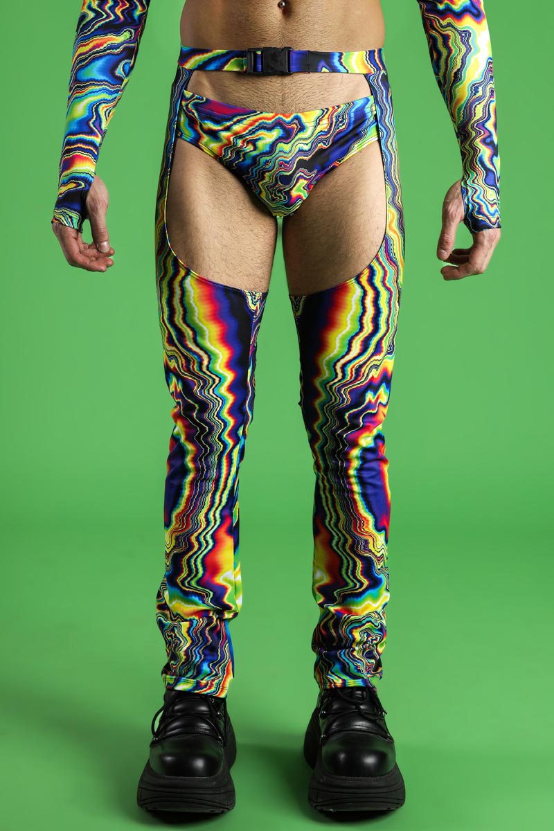 Make a bold entrance with these eye-catching men's chaps pants, designed in the electrifying Color Warp pattern. These pants feature an innovative chaps style, offering a daring and unique look. The snug fit ensures comfort while accentuating your silhouette. Perfect for pride events, raves, or any festival, these pants are a true testament to fearless fashion. Celebrate your style with these standout pants from our pride collection.