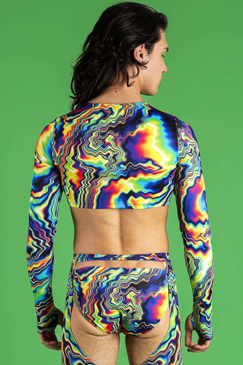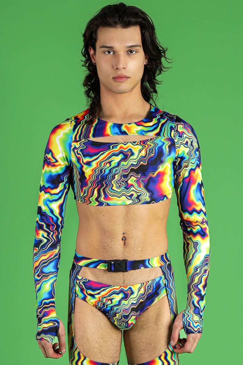 Elevate your festival wardrobe with this striking men's long-sleeved keyhole crop top, featuring the dynamic Color Warp pattern. The crop top showcases a unique keyhole neckline that adds an edgy flair to the design. The long sleeves provide a sleek, fitted look, perfect for making a statement at pride events, raves, or any festival. The vibrant Color Warp print ensures you stand out in any crowd. Crafted as part of our pride collection, this top celebrates diversity and individuality.