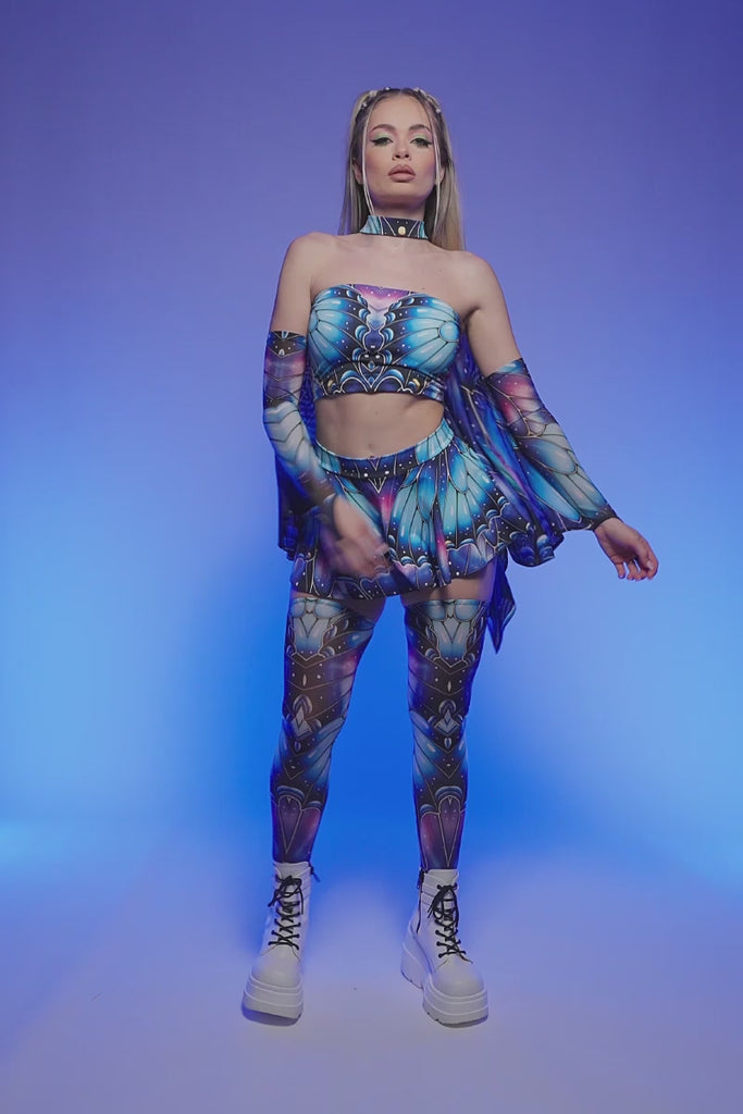 This rave mini skirt is a dreamy explosion of electric blues and purples, with bold butterfly wing patterns that move like magic under lights. Flowy, fierce, and ready to slay any dance floor, it’s a must-have for your next festival fit. Slip it on and own your power.