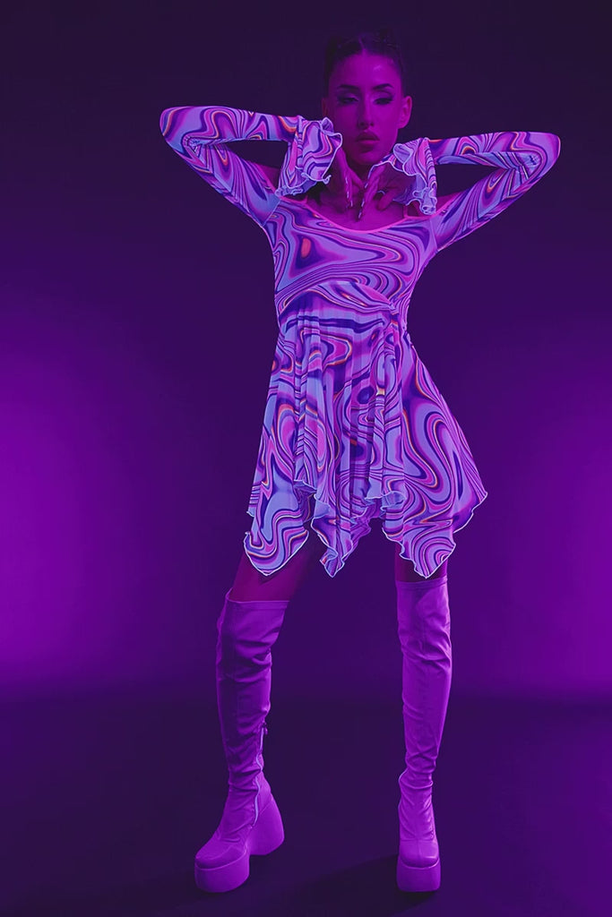 Twirl into the spotlight in this flounce-sleeve sundress, soaked in hypnotizing swirls of fuchsia, violet, and electric white with flashes of cosmic blue. The flowy shape moves like a fever dream, made to light up your rave look. U don’t chase the energy—u are the energy.