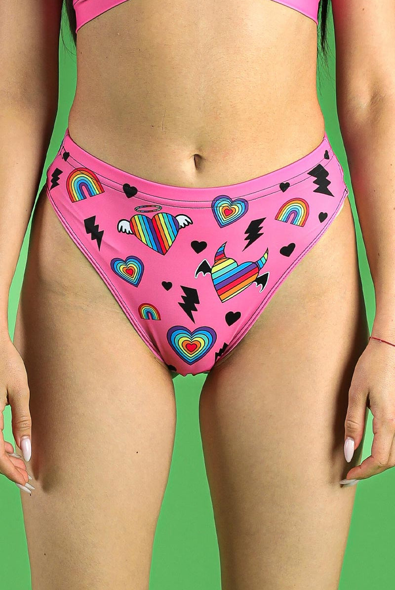 These high-cut bottoms feature the vibrant and playful Cupid's Canvas pattern, showcasing colorful hearts and rainbows on a bright pink background. Designed with a flattering high-cut leg, they provide a comfortable and stylish fit for any festival, pride event, or rave. The waistband offers secure fit, ensuring they stay in place during all your activities.