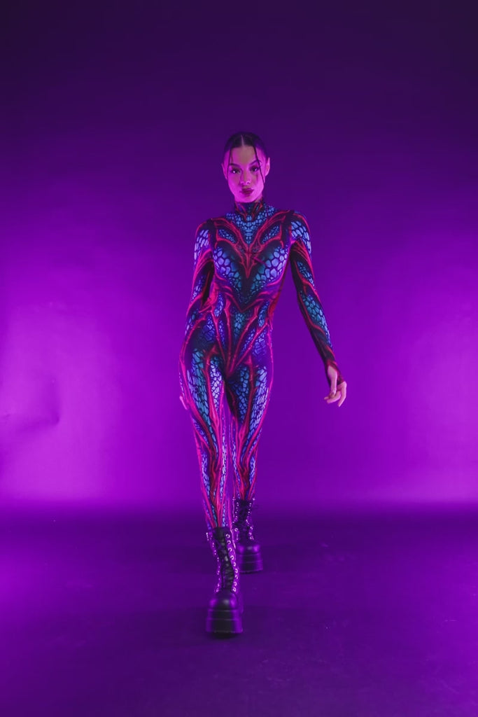 Unleash your inner rebel with the Daemonia women's costume—a fusion of dark elegance and fierce design. With its high neckline, front zipper, and intricate demonic patterns, this suit is built to command attention. The textured fabric and bold colors scream rave-ready, while its snug fit ensures u stay fierce all night long.
