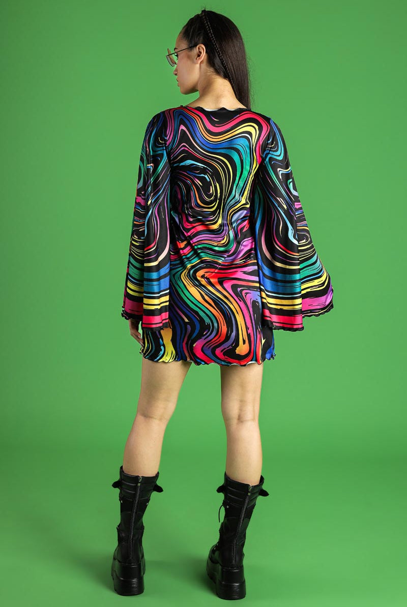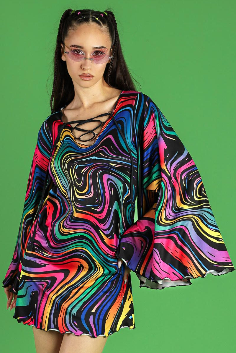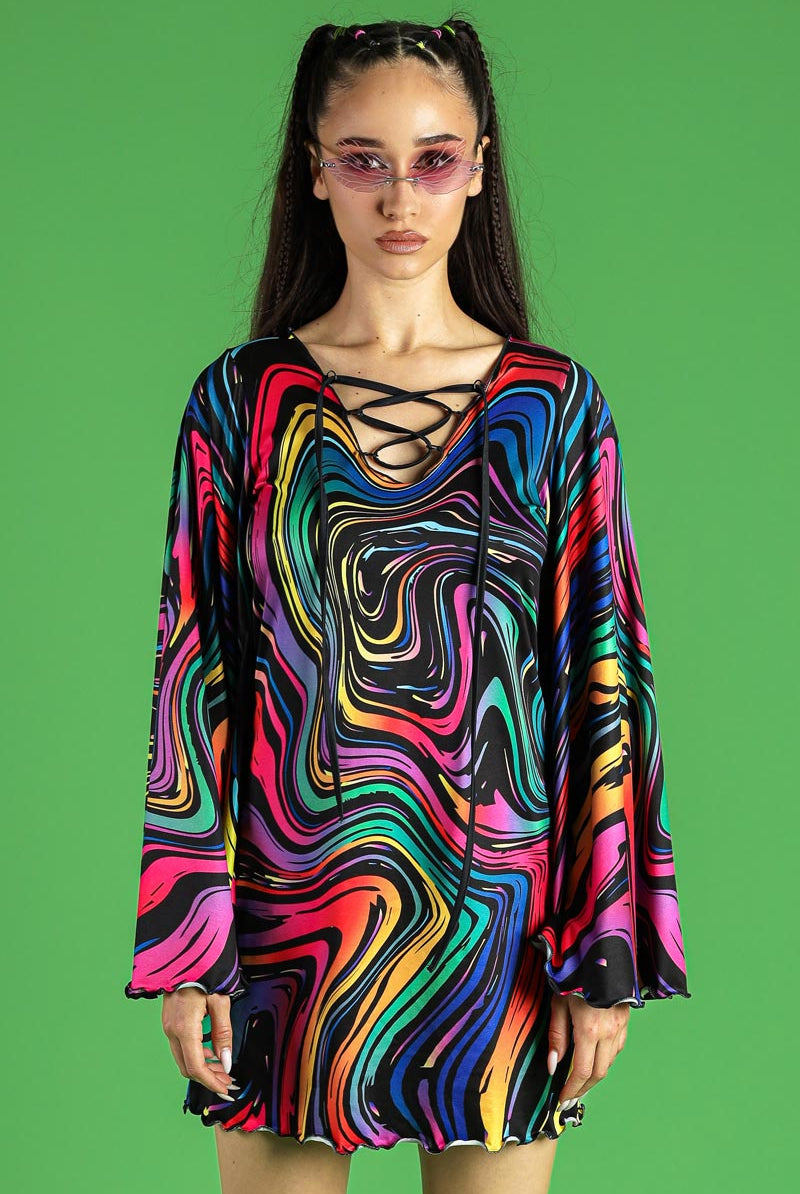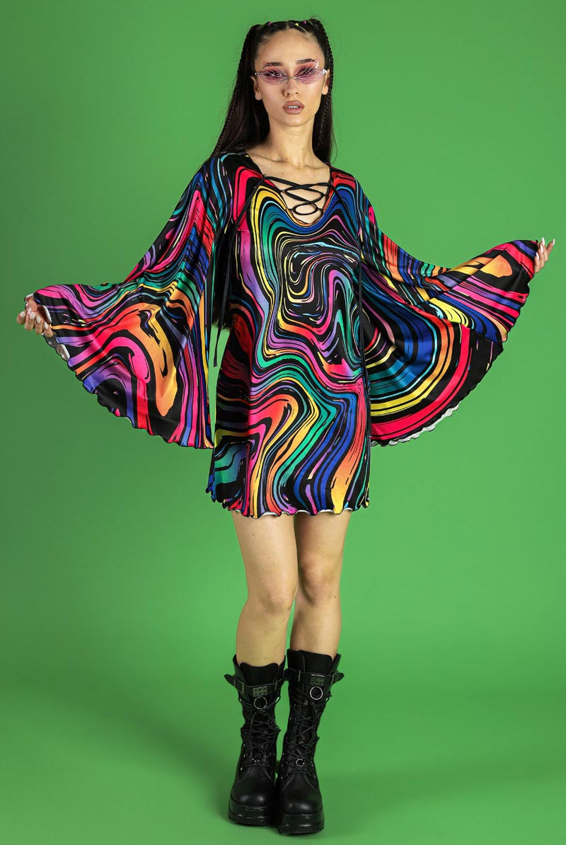 Indulge in the colorful allure of the Dazzle Dance dress, a striking addition to our pride collection. This dress features a vivid, swirling pattern that commands attention and symbolizes the vibrant spirit of pride celebrations. The lace-up neckline not only adds an edgy touch but also provides a customizable fit, enhancing the overall comfort and style. Its lightweight fabric flows beautifully, making it perfect for dancing and movement at any festival. With its playful yet sophisticated design, this dress is an ideal choice for those looking to express themselves boldly and brightly at pride, rave, or any festive event.