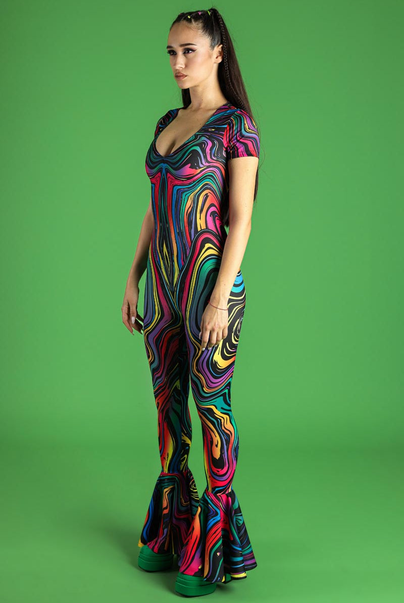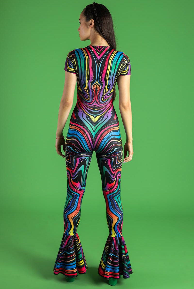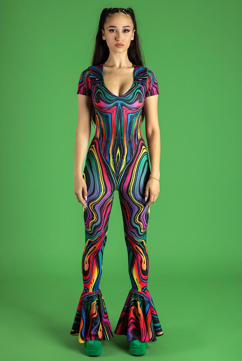 Introducing our enchanting v-neckline bell-bottoms jumpsuit, a dazzling addition to our Pride Collection. Named Dazzle Dance, this piece boasts a captivating pattern that adds an extra flair to your ensemble. The jumpsuit features a flattering v-neckline that accentuates the collarbones and sleeves for a touch of elegance. With bell-bottoms that elongate the legs and create graceful movement with every step, this jumpsuit is designed to turn heads. Fastening discreetly for a secure fit, it allows you to dance and celebrate freely at pride events, raves, and festivals. Embrace your unique style and celebrate your pride with this stunning jumpsuit that exudes confidence and empowerment.