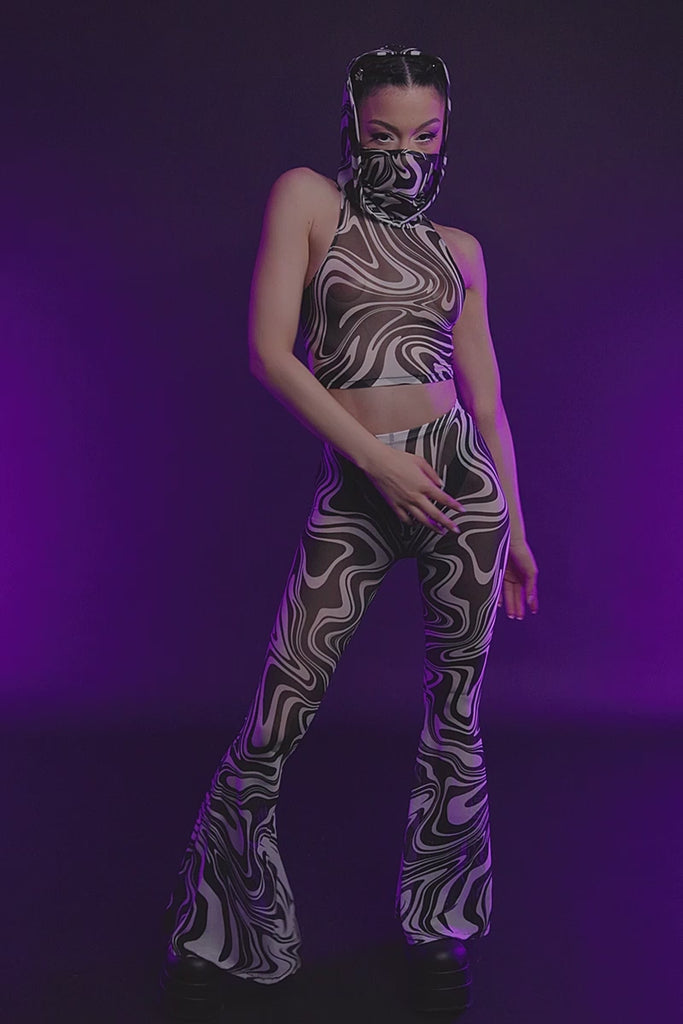 Own the night in this hypnotizing monochrome set featuring a hooded crop top and flared pants drenched in trippy black and white swirls. The sleek fit sculpts u like a shadow goddess, made to haunt every beat. This rave outfit is pure contrast—u don’t follow light or dark, u bend both.