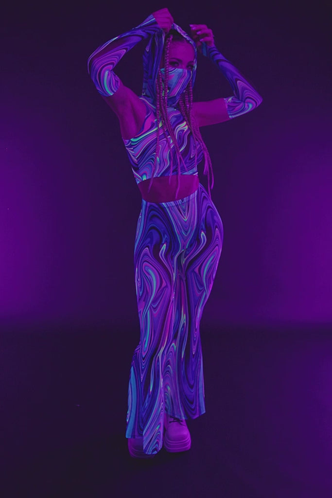 Slide into a surreal state with this rave-ready set: a hooded crop top, flared pants, and arm warmers splashed in icy blues, bubblegum pinks, and hypnotic black swirls. The fit hugs u like a second skin while the hood brings mystery. U didn’t come to rave—you came to enchant.