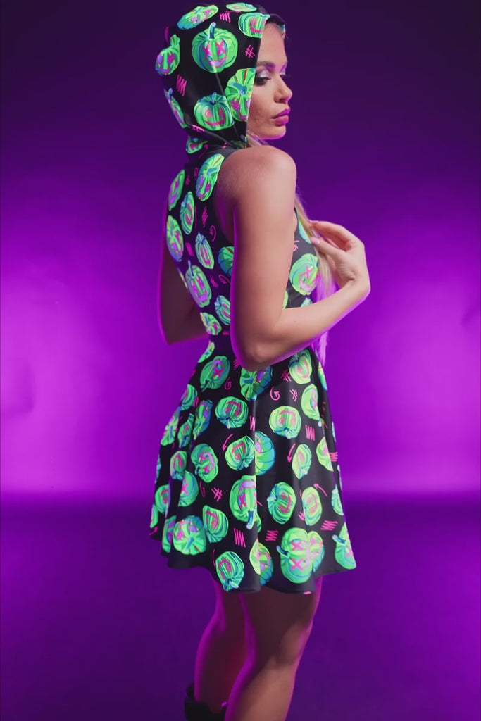 Be a metaphor that stands out wearing this daring hoodie skater dress showered with tiny electric pumpkins print over a pitch black. The sleeveless design and the circle skirt combined with a cute hoodie are the winning ticket to perfection. ‘Cuz you take it beyond the norms.