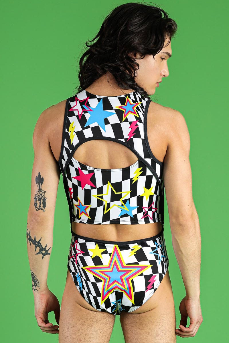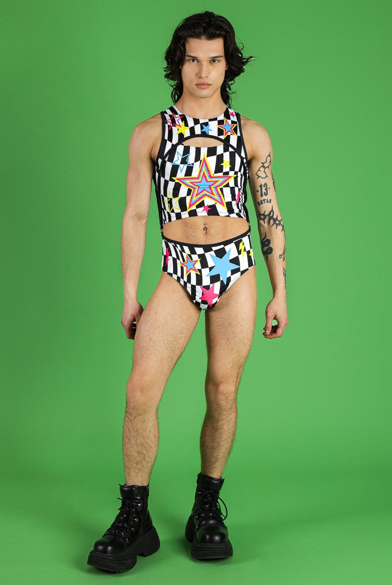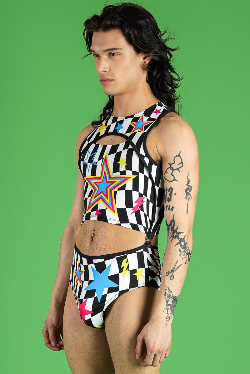 Elevate your festival attire with this striking men's two-piece bodysuit, perfect for pride events, raves, and other festive celebrations. Featuring the vibrant Flash Pop design, this unique ensemble consists of 2 parts, connected seamlessly by metal hooks on either side of the torso. The bodysuit showcases a keyhole cut-out on the top part and additional cut-outs for an edgy look. This cohesive outfit is designed to celebrate individuality and pride with boldness and style.