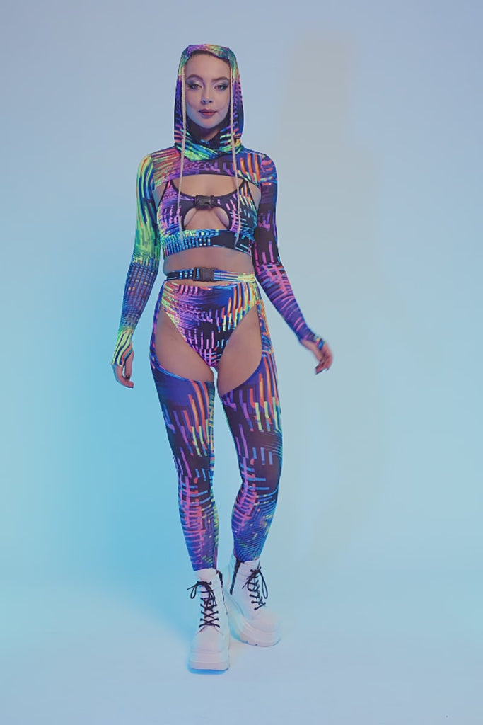 This set features a two piece crop top with matching booty shorts and high-waisted chap pants layered on top. The neon glitch design creates strong contrast, while the fitted pieces define your shape. Stretch fabric keeps everything secure and comfortable for nonstop movement.