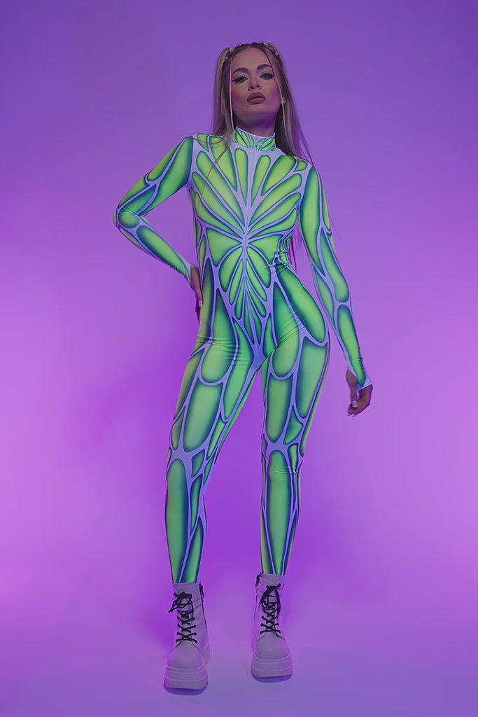 This high-voltage costume with a front zipper is pure rave venom. Covered in a neon green winged print that glows under blacklight, it sculpts your body like liquid energy. Sleek, stretchy, and unapologetically bold—this rave outfit demands attention. Zip up and electrify the night.