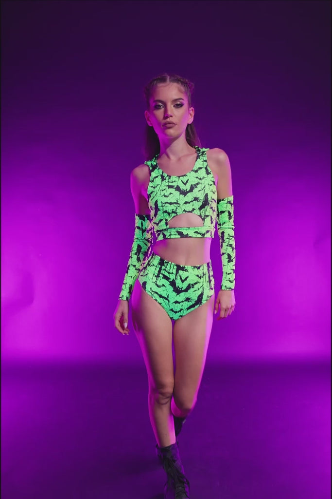 Light up the night in the Glowing Bats set. This UV-reactive ensemble features a hooded bra top, booty shorts, and matching sleeves for that extra pop of boldness. With its edgy bat pattern that glows under blacklight, you’ll steal the show.