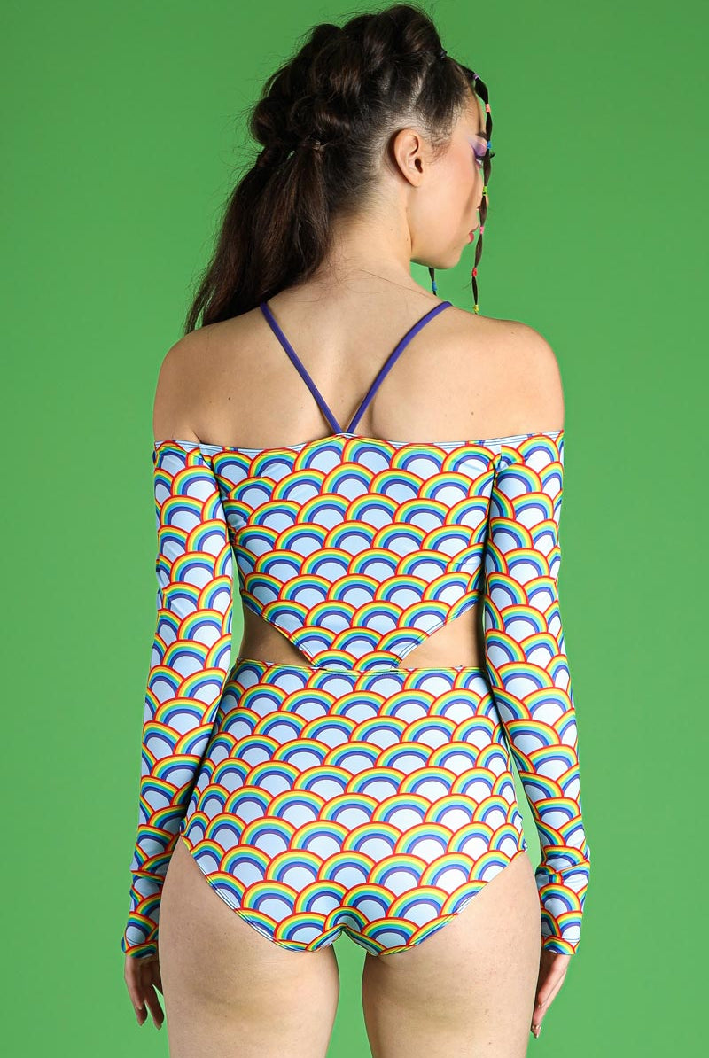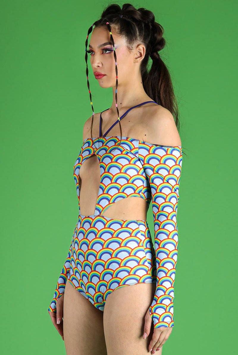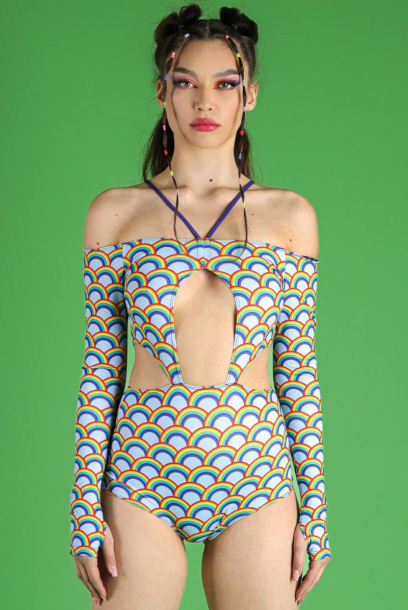 Introducing our stunning off-shoulder cutout bodysuit with a v-string, designed to make you stand out at any pride, rave, or festival. The bodysuit showcases the vibrant Heavenly Sky pattern, a captivating print that’s sure to turn heads. Featuring a unique off-the-shoulder design and a flattering v-string back, this piece ensures both comfort and style. The cutouts add an edgy touch, while the long sleeves provide a sleek finish. As part of our pride collection, this bodysuit is perfect for making a bold statement and celebrating in style.