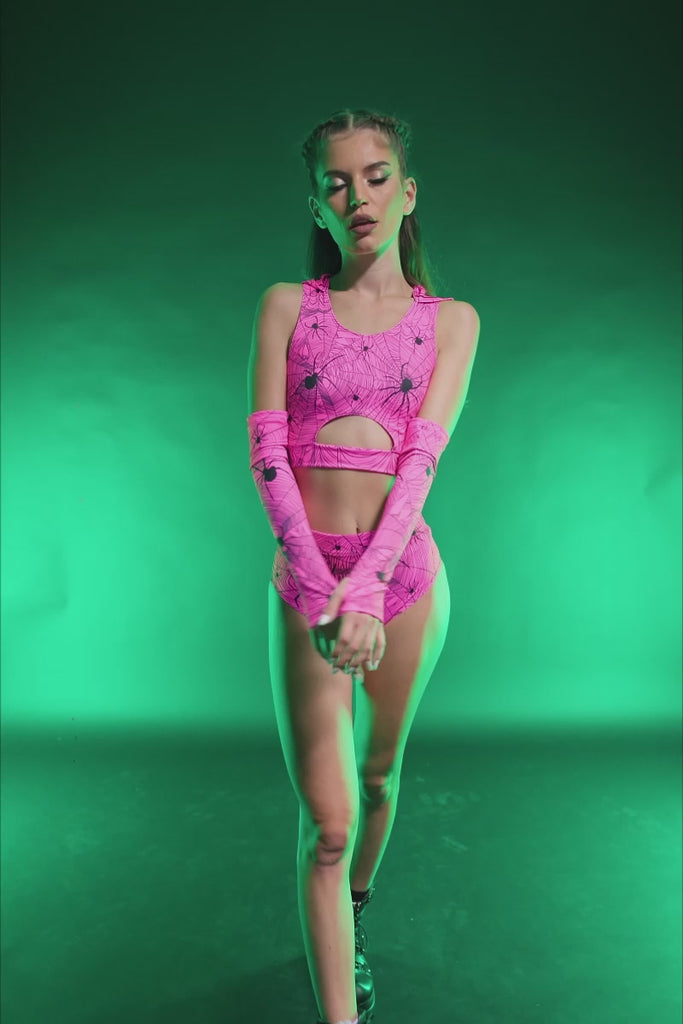 Unleash your rebel in the Hot Pink Spiderwebs set! The bold spiderweb pattern, electrifying hot pink hue, and UV-reactive glow will have you stealing the spotlight. With edgy sleeves available, this set is a fierce combo designed to make you stand out at any rave or party.