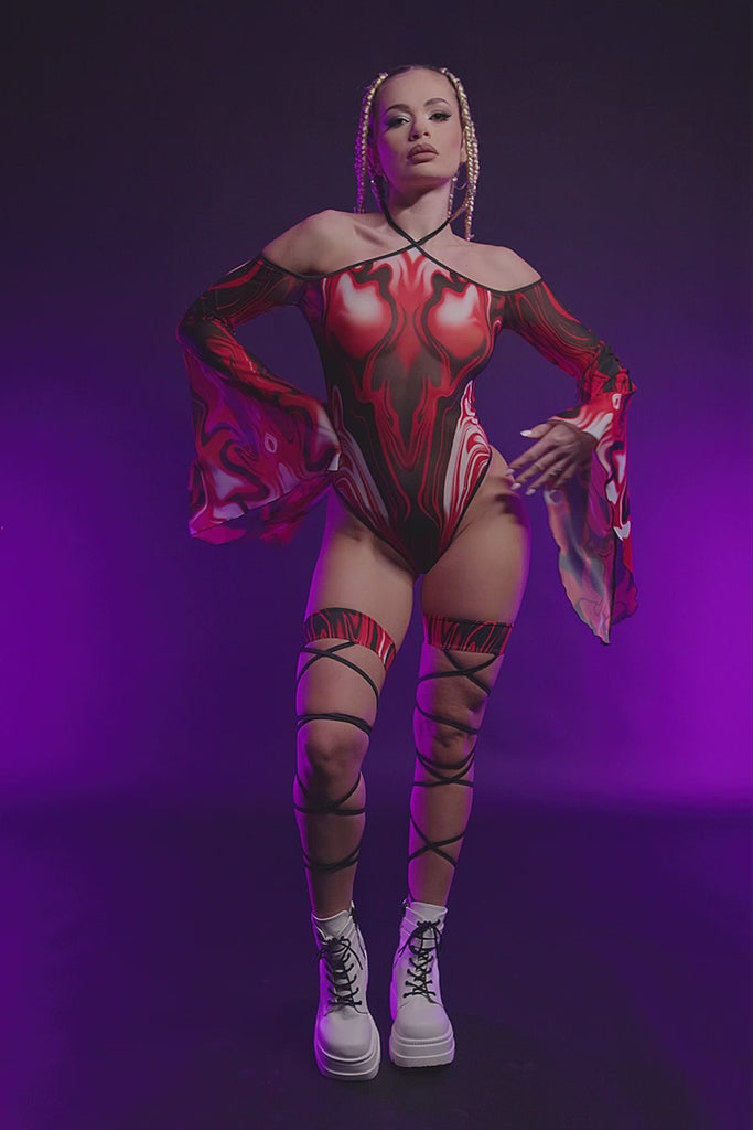 Unleash your inner demon in this V-neck strap bodysuit with garters, blazing with hypnotic swirls of blood red, black, and ghostly white. The wickedly sculpted fit grips your curves like a dark spell, built for fearless moves and fiery vibes. This rave outfit isn’t cute—it’s straight-up dangerous.