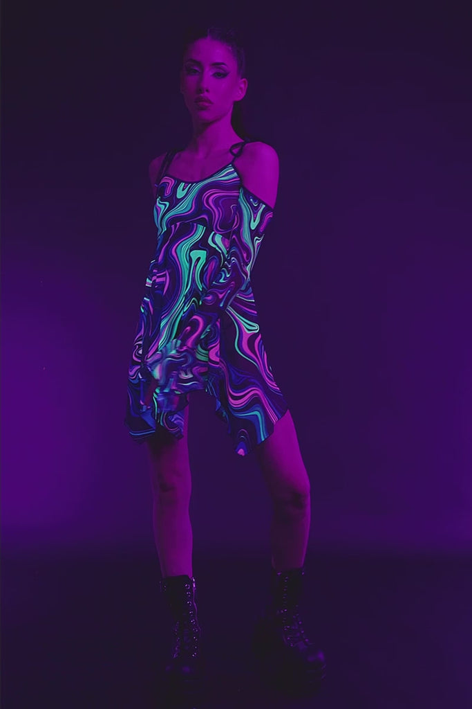 Slip into cosmic chaos with this sundress featuring flounce sleeves and a hypnotic swirl of neon green, hot pink, electric blue, and lemon on a blackout base. The flowy silhouette moves like liquid rhythm, turning every twirl into a show. This rave outfit? It’s pure visual mischief—u came to stir it up.
