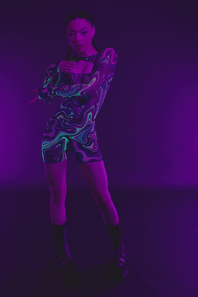 Dive into the glitch zone with this cut-out romper, electrified in neon swirls of pink, green, yellow, and blue over a blackout base. The body-hugging fit flexes with every move, built for midnight mischief and rave domination. This rave outfit is pure chaos—u don’t just turn heads, u scramble ‘em.