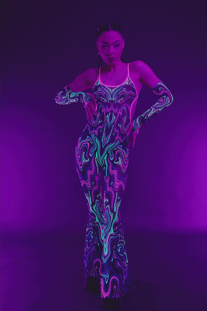 Slip into this open-back jumpsuit with matching arm warmers and unleash chaos in color. Swirled in neon pinks, greens, blues, and yellows over blackout vibes, this hypnotizing rave outfit hugs your curves and flares out with fierce flow. U don’t just show up—you shut it down.
