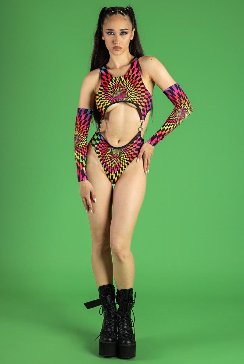 Introducing the Hypnotic Love bodysuit, a mesmerizing underboob 2-piece cut-out design. This bold bodysuit features an intricate hypnotic print that captivates with its vivid, dynamic patterns. The underboob cut-out adds a daring touch, while the secure fastening on the sides ensures a comfortable fit. Designed as part of our pride collection, this unique piece is perfect for making a statement at pride events, raves, or any festival. Embrace your individuality and stand out in the Hypnotic Love bodysuit, a celebration of color and confidence.