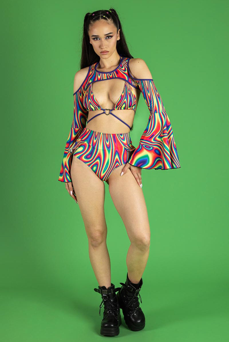 Embrace the full vibrancy of our Infinite passion set, which includes a strappy bikini top with a heart ring and matching ruffled shorts. The ensemble is bathed in colors that swirl across each piece, creating a seamless look of dynamic motion and vibrant energy. Complete with dramatic sleeves that enhance the psychedelic theme, this set is perfect for those looking to showcase their unique style in a bold and playful way.