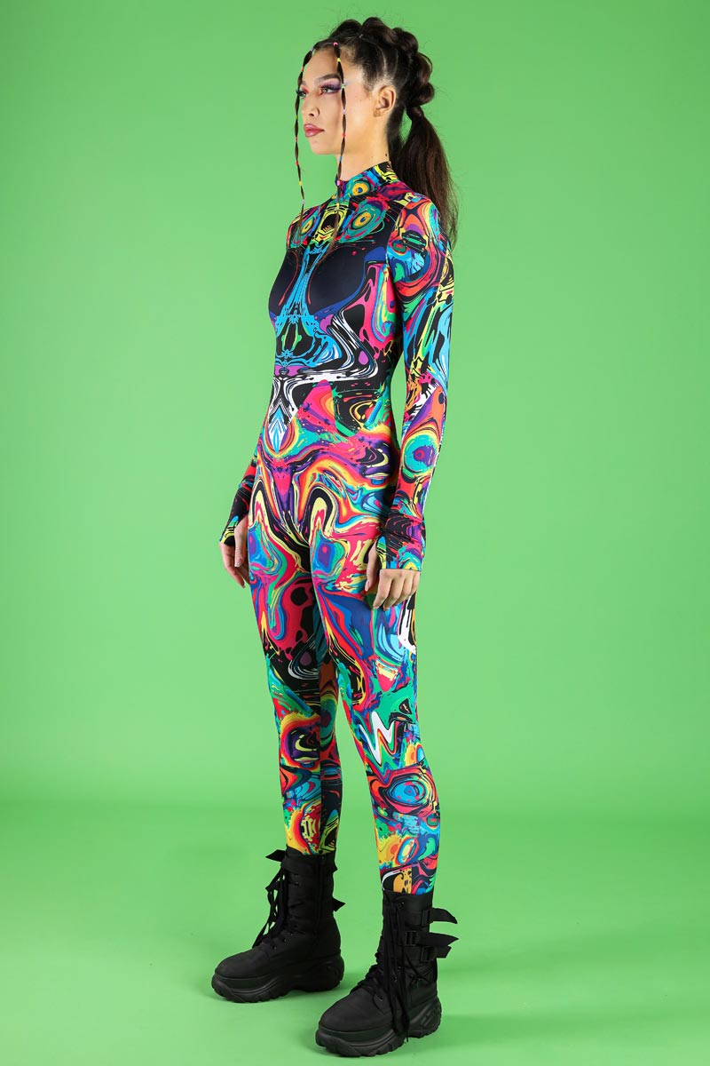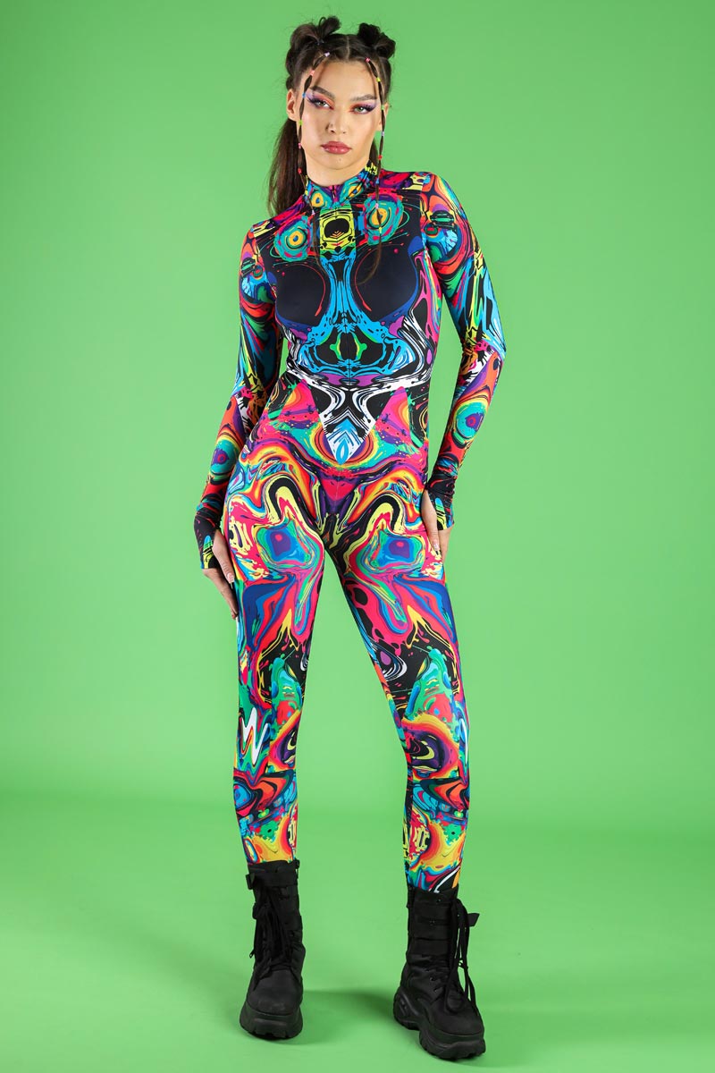 Introducing our vibrant women's costume, designed for those who love to stand out at pride events, raves, and festivals. This stunning piece features the Inksplosion pattern, showcasing a mesmerizing blend of colors that create a dynamic visual effect. The costume has long sleeves and a high neckline, offering both style and comfort. A convenient front zipper ensures easy fastening, while the overall fit accentuates your figure, making it a perfect choice for celebrating individuality and pride. Embrace the spirit of festivity with this unique and eye-catching design.